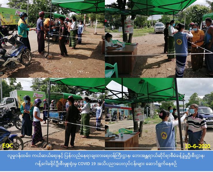 လူမှုဝန်ထမ်း၊ ကယ်ဆယ်ရေးနှင့် ပြန်လည်နေရာချထားရေးဝန်ကြီးဌာန၊ ဘေးအန္တရာယ်ဆိုင်ရာ စီမံခန့်မှုဦးစီးဌာန၊ ဂန့်ဂေါခရိုင်ဦးစီးမှူးရုံးမှ တာဝန်ရှိသူများသည် (၁၀-၆-၂၀၂၀) ရက်နေ့ (၀၈:၃၀) နာရီအချိန်မှ (၁၇:၃၀) နာရီအချိန်ထိ လတ်တလော နိုင်ငံအသီးသီးတွင် ကူးစက်ပြန့် ပွားလျက်ရှိသော Covid-19 ကူးစက်ရောဂါ ကြိုတင်ကာကွယ်ရေးအတွက် ဂန့်ဂေါခရိုင်အတွင်း ယာဉ်အဝင်အထွက်စီးနင်း လိုက်ပါလာသော ခရီးသည်များအား ကိုယ်အပူချိန်များတိုင်းထွာ ပေးခြင်းနှင့် ပြည်တွင်းပြည်ပမှ ပြန်လာသူများအား စာရင်းပြုစုခြင်းတို့ကို ခရိုင်အုပ်ချုပ်ရေးမှူး၊ မြို့နယ်အုပ်ချုပ်ရေးမှူး၊ ဌာနဆိုင်ရာအသီးသီးမှ တာဝန်ရှိသူများနှင့်အတူ ပူးပေါင်းပါဝင်ဆောင် ရွက်လျက်ရှိပါကြောင်း သတင်းရရှိပါသည်။