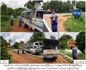လူမှုဝန်ထမ်း၊ ကယ်ဆယ်ရေးနှင့်ပြန်လည်နေရာချထားရေးဝန်ကြီးဌာန၊ ဘေးအန္တရာယ်ဆိုင်ရာစီမံခန့်ခွဲမှုဦးစီးဌာန၊ ပဲခူးတိုင်းဒေသကြီးဦးစီးမှူးရုံးမှ တာဝန်ရှိသူများသည် (၁၂-၆-၂၀၂၀)ရက်နေ့တွင် သာယာဝတီခရိုင်၊ လက်ပံတန်းမြို့နယ်၊ ရှမ်းစု၊ ကျွန်းကလေးကျေးရွာ၊ ဂရံစံပြကျးရွာ၊ကျွဲ နစ်ကျေးရွာ၊ ကိုင်းတောကျေးရွာ၊ ကြို့ပင်စခန်းကျေးရွာ၊ ကညင်တန်းကျေးရွာတို့တွင် (COVID – 19)ရောဂါကူးစက်ပျံ့နှံ့မှုများနှင့်ပတ်သက်၍ ပြည်သူများထံသို့ အသိပညာပေးနှိုးဆော်မှုများ ဆောင်ရွက်ခဲ့ကြောင်း သတင်းရရှိပါသည်။