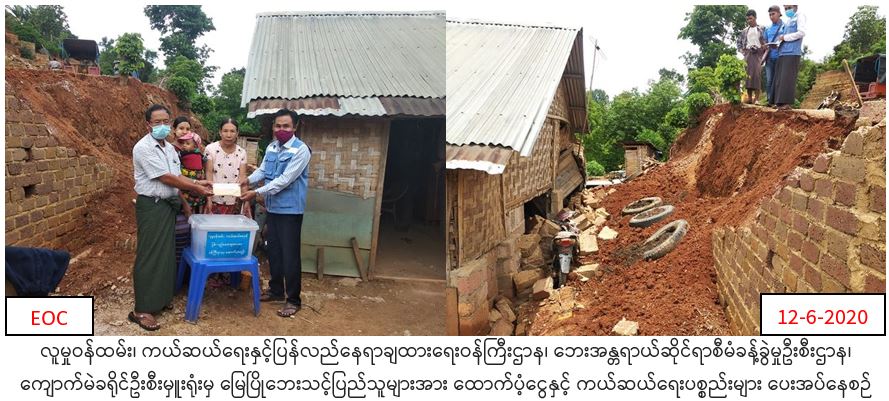 လူမှုဝန်ထမ်း၊ ကယ်ဆယ်ရေးနှင့်ပြန်လည်နေရာချထားရေးဝန်ကြီးဌာန၊ ဘေးအန္တရာယ်ဆိုင်ရာစီမံခန့်ခွဲမှုဦးစီးဌာန၊ ကျောက်မဲခရိုင်ဦးစီးမှူးရုံးမှ တာဝန်ရှိသူများသည် (၉-၆-၂၀၂၀)ရက်နေ့၌ ကျောက်မဲမြို့၊ အမှတ်(၉)ရပ်ကွက်၊ နယ်မြေ(၁၂)တွင် မိုးသည်းထန်စွာရွာသွန်းပြီး တောင်ကမ်းပါးယံမြေပြိုကျမှုကြောင့် ပျက်စီးခဲ့သော နေအိမ်(၁)လုံးအတွက် အိမ်ဆောက်ပစ္စည်းဖိုးငွေ(၉၀၀၀ဝိ/-)၊ အိမ်ထောင်စု(၁)စုမှ လူဦးရေ(၉)ဦးအတွက် ဆန်ရိက္ခာဖိုးငွေ(၁၈၉၀ဝိ/-)၊ စုစုပေါင်း ထောက်ပံ့ငွေ(၁၀၈၉၀ဝိ/-)ကျပ်နှင့် ကယ်ဆယ်ရေးပစ္စည်း(၁၀)မျိုးပါ (၁)ပုံးအား (၁၂-၆-၂၀၂၀)ရက်နေ့ (၁၄း၀၀)နာရီအချိန်တွင် ရပ်ကွက်အုပ်ချုပ်ရေးမှူးနှင့်အတူ ပြည်သူများလက်၀ယ်အရောက်ထောက်ပံ့ပေးအပ်ခဲ့ကြောင်း သတင်းရရှိပါသည်။