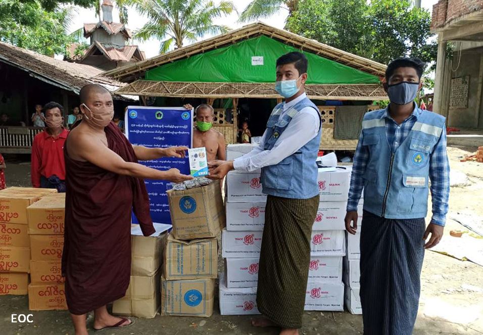 ၄။ (၁၀-၆-၂၀၂၀)နေ့နှင့်(၁၁-၆-၂၀၂၀)နေ့တို့တွင်လည်း ရခိုင်ပြည်နယ်၊ စစ်တွေမြို့နယ်ရှိ ဘောဒူဖ(၁)၊ ဒါးပိုင်၊ သက္ကေပြင် IDP စခန်း စုစုပေါင်း(၃)ခုနှင့် မင်းပြားမြို့နယ်ရှိ ကျွန်းတောရွှေဖောင်တောဘုန်းကြီးကျောင်း၊ ရွာသစ်ကေဘုန်းကြီးကျောင်း၊ နရမ်းရွာကြီးဓမ္မာရုံ၊ နရမ်းအုပ်စုဘုန်းတော်ကြီးကျောင်း၊ သေကန်ဘုန်းတော်ကြီးကျောင်း၊ အမ်းသားဘုန်းတော်ကြီးကျောင်း စုစုပေါင်းတိုက်ပွဲရှောင်စခန်း(၆)ခုသို့သွားရောက်၍ ဆပ်ပြာ(၂၃၆၉)တောင့်၊ အဝတ်Mask (၄၇၃၈)ခု၊ လက်သန့်ဆေးရည် (၁၁၈၀)ဗူး၊ အပူချိန်တိုင်းကိရိယာ (၆)ခု၊ ဗီနိုင်း(၁၇)ခု၊ Hand Speaker (၆)ခု ဆပ်ပြာ(၃၅၀၀)ခဲ၊ ဆပ်ပြာရည်(၈၆)ဗူး၊ SurgicalMask (၃၅၀၀)ခုနှင့်COVID-19အသိပညာပေးအသံဖိုင်ထည့်သွင်းထားသော Memory Stick(၆) ခုတို့အား ထောက်ပံ့ခဲ့ပါသည်။