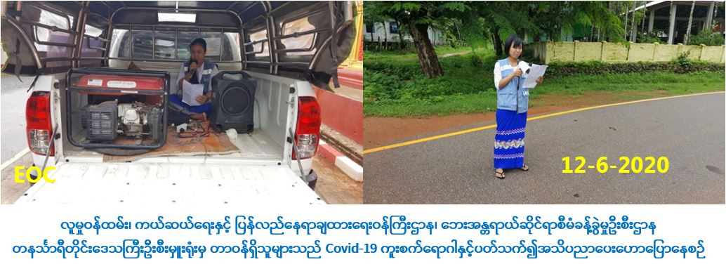 လူမှုဝန်ထမ်း၊ ကယ်ဆယ်ရေးနှင့် ပြန်လည်နေရာချထားရေးဝန်ကြီးဌာန၊ ဘေးအန္တရာယ်ဆိုင်ရာစီမံ ခန့်ခွဲမှုဦးစီးဌာန၊ တနင်္သာရီတိုင်းဒေသကြီးဦးစီးမှူးရုံးမှ တာဝန်ရှိသူများသည် (၁၂-၆-၂၀၂၀) ရက်နေ့ တွင် တနင်္သာရီတိုင်းဒေသကြီး၊ ထားဝယ်ခရိုင် ၊ ထားဝယ်မြို့နယ်၊ ဆင်ဆိပ်ရပ်ကွက်၊ ဝဲကျွန်း ရပ်ကွက်၊ တလိုင်းထိန်ရပ်ကွက်နှင့် တလိုင်းမရပ်ကွက်တို့တွင် hand speaker၊ လောစပီကာတို့ဖြင့် Covid-19 လတ်တလော အသက်ရှူလမ်းကြောင်းဆိုင်ရာရောဂါ ကြိုတင်ကာကွယ်ထိန်းချုပ် နိုင်ရန် အများပြည်သူသို့ အသိပညာပေးပန်ကြားချက်များအား လှည့်လည်ဟောပြောခြင်းတို့ကို ဆောင်ရွက်ခဲ့ကြောင်း သတင်းရရှိပါသည်။