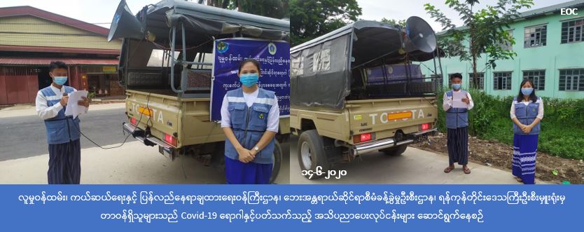 (၁၄ -၆-၂၀၂၀) ရက်နေ့တွင် လူမှုဝန်ထမ်း၊ ကယ်ဆယ်ရေးနှင့် ပြန်လည်နေရာချထားရေးဝန်ကြီးဌာန၊ ဘေးအန္တရာယ်ဆိုင်ရာ စီမံခန်ခွဲမှုဦးစီးဌာန၊ ရန်ကုန်တိုင်းဒေသကြီးဦးစီးမှူးရုံးမှ အရာထမ်း၊ အမှုထမ်းများသည် ရန်ကုန်အရှေ့ပိုင်းခရိုင်၊ ဒဂုံမြို့သစ် (ဆိပ်ကမ်း)မြို့နယ်၊ (၅၈)ရပ်ကွက်၊ (၅၉)ရပ်ကွက်၊ (၆၀)ရပ်ကွက်၊ (၆၁) ရပ်ကွက်၊ (၆၇) ရပ်ကွက်၊ (၆၈) ရပ်ကွက်တို့တွင် (Covid-19) အသက်ရှူလမ်းကြောင်းဆိုင်ရာရောဂါနှင့် ပတ်သက် ၍ အများပြည်သူများသိရှိလိုက်နာနိုင်ရန် ကျန်းမာရေးနှင့် အားကစားဝန်ကြီးဌာနမှ ထုတ်ပြန်ထားသော အသိပေး ကြေငြာချက်များအား ရပ်ကွက်များအတွင်း အသိပေးကြော်ငြာခြင်းများ ပြုလုပ်ခဲ့ကြောင်း သိရှိရပါသည်။
