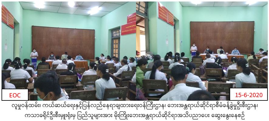 လူမှုဝန်ထမ်း၊ ကယ်ဆယ်ရေးနှင့်ပြန်လည်နေရာချထားရေးဝန်ကြီးဌာန၊ ဘေးအန္တရာယ်ဆိုင်ရာစီမံခန့်ခွဲမှုဦးစီးဌာန၊ ကသာခရိုင်ဦးစီးမှူးရုံးမှ (၁၅.၆.၂၀၂၀) ရက်နေ့တွင် ကသာမြို့နယ် အထွေထွေအုပ်ချုပ်ရေးဦးစီးဌာနခန်းမတွင် မြို့နယ်အဆင့်ဌာနဆိုင်ရာများ၊ ရပ်ကွက်/ကျေးရွာများမှ အုပ်ချုပ်ရေးမှူးများ၊ ရပ်/ကျေးစာရေးများ လ၀က်အစည်းအဝေးတွင် မိုးကြိုးဘေး၊ အသိပညာပေးဆွေးနွေးဟောပြောခဲ့ပြီး လက်ကမ်းစာစောင်များဖြန့်ဝေခြင်းများ ဆောင်ရွက်ခဲ့ကြောင်း သတင်းရရှိပါသည်။