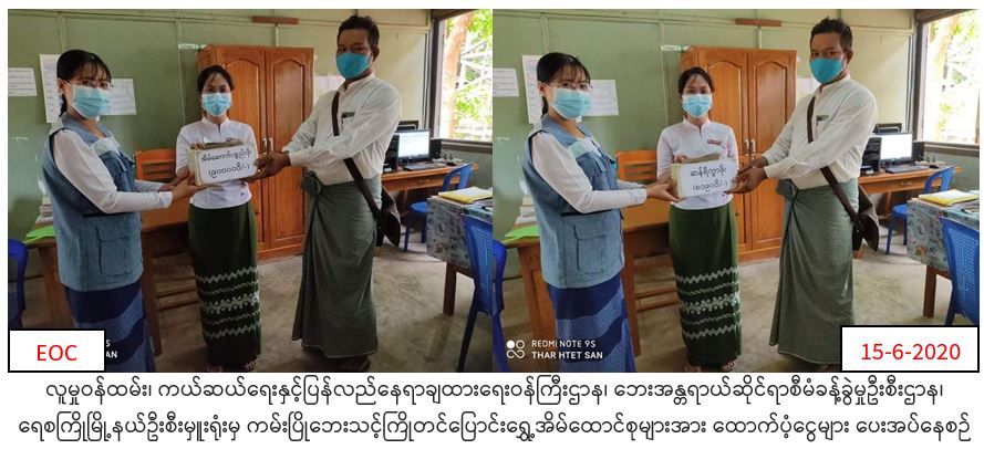 လူမှုဝန်ထမ်း၊ ကယ်ဆယ်ရေးနှင့်ပြန်လည်နေရာချထားရေးဝန်ကြီးဌာန၊ ဘေးအန္တရာယ်ဆိုင်ရာစီမံခန့်ခွဲမှုဦးစီးဌာန၊ ရေစကြိုမြို့နယ်ဦးစီးမှူးရုံးမှ တာဝန်ရှိသူများသည် ရေစကြိုမြို့နယ်၊ အောင်ပန်းချောင်းကျေးရွာအုပ်စု၊ အောင်ပန်းချောင်းကျေးရွာတွင် (၁၂-၆-၂၀၂၀)ရက်နေ့၊(၀၉:၀၀)အချိန်၌ ချင်းတွင်းမြစ်ရေတိုက်စား ကမ်းပါးပြိုကျမှုကြောင့် ကြိုတင်ဖျက်သိမ်းပြောင်းရွှေ့ခြင်းများ ဆောင်ရွက်ခဲ့ကြရာ ကြိုတင်ဖျက်သိမ်းပြောင်းရွှေ့ လူနေအိမ်(၉)လုံး၊ အိမ်ထောင်စု(၉)စု၊ လူဦးရေ(၃၉)ဦးတို့အတွက် အိမ်ဆောက်ပစ္စည်းဖိုး(၉၀၀၀၀ဝိ/-)၊ ဆန်ရိက္ခာဖိုး(၈၁၉၀ဝိ/-)၊ စုစုပေါင်းကျပ်(၉၈၁၉၀ဝိ/-)အား (၁၅-၆-၂၀၂၀)ရက်နေ့၊ (၁၄:၀၀)အချိန်တွင် ရေစကြိုမြို့နယ် အထွေထွေအုပ်ချုပ်ရေးရုံး၌ မြို့နယ်အထွေထွေအုပ်ချုပ်ရေးရုံးမှ တာဝန်ရှိသူနှင့်အတူ ကျေးရွာအုပ်ချုပ်ရေးမှူးလက်ဝယ်အရောက် ထောက်ပံ့ပေးအပ်ခဲ့ကြောင်း သတင်းရရှိပါသည်။