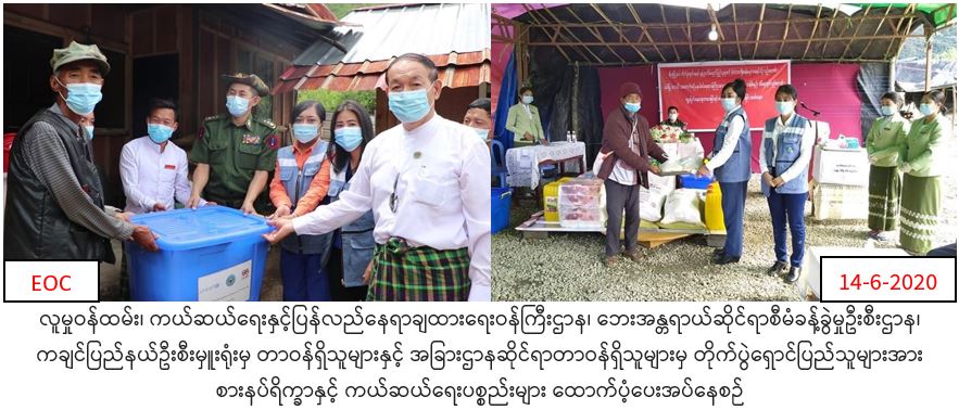 လူမှုဝန်ထမ်း၊ ကယ်ဆယ်ရေးနှင့်ပြန်လည်နေရာချထားရေးဝန်ကြီးဌာန၊ ဘေးအန္တရာယ်ဆိုင်ရာစီမံခန့်ခွဲမှုဦးစီးဌာန၊ ကချင်ပြည်နယ်ဦးစီးမှူးရုံးမှ တာဝန်ရှိသူများသည် ကချင်ပြည်နယ်အတွင်း ပြည်တွင်းနေရပ်စွန့်ခွာသူများ ပြန်လည်နေရာချထားရေးနှင့် ယာယီခိုလှုံရာစခန်းများ ပိတ်သိမ်းရေးဆိုင်ရာ ပြည်နယ်အဆင့်ကော်မတီ ဒုတိယဥက္ကဌ(၁)၊ ကချင်ပြည်နယ်အစိုးရအဖွဲ့ဝင်၊ လုံခြုံရေးနှင့်နယ်စပ်ရေးရာဝန်ကြီး၊ ပြည်သူ့လွှတ်တော်ကိုယ်စားလှယ်တို့နှင့်အတူ ချီဖွေမြို့နယ်၊ ပန်ဝါမြို့ရှိ စခန်း(၂)ခုမှ မူလကျေးရွာ၊ နယ်စပ်ဒေသနှင့်တိုင်းရင်းသားလူမျိုးများဖွံ့ဖြိုးတိုးတက်ရေးဝန်ကြီးဌာနမှ ဆောက်လုပ်ပေးထားသောနေရာနှင့် ဆွေမျိုးအိမ်များသို့ ပြောင်းရွှေ့နေထိုင်သည့် တိုက်ပွဲရှောင်ပြည်သူများအတွက် စုစုပေါင်းတန်ဖိုး(၄၃၉၂၅၃၀၀/-)ရှိ စားနပ်ရိက္ခာ(ဆန်၊ဆီ၊ပဲ၊ဆား)(၆)လစာနှင့် ပြောင်းရွှေ့စရိတ်၊ ပစ္စည်း(၂၂)မျိုးပါ Family Kit (၈၁)ပုံးအား (၁၃-၆-၂၀၂၀)ရက်နေ့ (၁၅:၀၀)နာရီအချိန်တွင် အမှတ်(၂)ရပ်ကွက်စခန်းမှ ပြောင်းရွှေ့သည့်အိမ်ထောင်စု(၅၄)စုအတွက်လည်းကောင်း၊ (၁၄-၆-၂၀၂၀)ရက်နေ့ (၀၉:၃၀)နာရီအချိန်တွင် ခိုက်ဘာဂျီ(ဆော့ဇမ်)စခန်းမှ ပြောင်းရွှေ့သည့် အိမ်ထောင်စု(၂၇)စုအတွက်လည်းကောင်း သွားရောက်ထောက်ပံ့ပေးအပ်ခဲ့ကြောင်း သတင်းရရှိပါသည်။