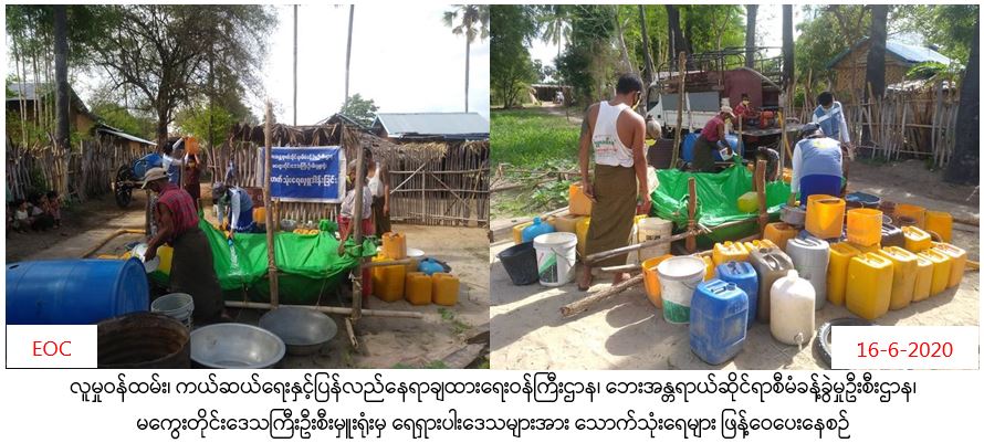 လူမှုဝန်ထမ်း၊ ကယ်ဆယ်ရေးနှင့်ပြန်လည်နေရာချထားရေး၀န်ကြီးဌာန၊ ဘေးအန္တရာယ်ဆိုင်ရာစီမံခန့်ခွဲမှုဦးစီးဌာန၊ မကွေးတိုင်းဒေသကြီးဦးစီးမှူးရုံးမှ တာဝန်ရှိသူများသည် သောက်သုံးရေခက်ခဲသော မကွေးမြို့နယ်၊ ကြာကန်ကျေးရွာအုပ်စု၊ ကြာကန်ကျေးရွာ(အနောက်ပိုင်း)၊ ဦးဝဲ(တဲတိုက်)၊ ဒေါ်အေး(တဲတိုက်)နှင့် အောင်ချမ်းသာကွက်သစ်ရှိ အိမ်ခြေ (၁၁၄) လုံး၊ အိမ်ထောင်စု(၁၂၂) စု၊ လူဦးရေ (၅၇၃) ဦးတို့အတွက် သောက်သုံးရေဂါလံ (၆၀၀၀) အား ( ၁၆- ၆-၂၀၂၀) ရက်နေ့ ( ၁၁ : ၀၀ ) နာရီအချိန်တွင် သွားရောက်ဖြန့်ဝေပေးခဲ့ကြောင်း သတင်းရရှိပါသည်။