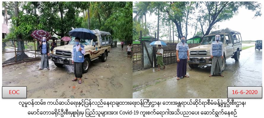 လူမှုဝန်ထမ်း၊ ကယ်ဆယ်ရေးနှင့် ပြန်လည်နေရာချထားရေးဝန်ကြီးဌာန၊ ဘေးအန္တရာယ်ဆိုင်ရာစီမံခန့်ခွဲမှုဦးစီးဌာန၊ မောင်တောခရိုင်ဦးစီးမှူးရုံးမှ တာဝန်ရှိသူများသည် (၁၆-၆-၂၀၂၀)ရက်နေ့တွင် မောင်တောမြို့နယ်၊ ရွှေဇားကျေးရွာအုပ်စု၊ ဂုံးနားရွာ၊ ကပ္ပကောင်းရွာ၊ ကံဘဲရွာ၊ စေတီပြင်ရွာ၊ အလယ်ရွာတို့တွင် အသံချဲ့စက်ဖြင့် (Covid-19) လတ်တလော အသက်ရှူလမ်းကြောင်းဆိုင်ရာ ရောဂါကြိုတင်ကာကွယ် ထိန်းချုပ်နိုင်ရန် အများပြည်သူသို့ အသိပညာပေးပန်ကြားချက်များ၊ ၂၀၂၀ပြည့်နှစ်၊ဇွန် ၁၀ရက်နေ့တွင် Covide19 ကူးစက်ရောဂါကာကွယ်ထိန်းချုပ် ကုသရေးဗဟိုကော်မတီမှ ထုတ်ပြန်ကြေငြာချက်အား လှည့်လည်ကြေညာခြင်းတို့ကို ဆောင်ရွက်ခဲ့ကြောင်း သတင်းရရှိပါသည်။