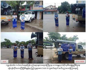 လူမှုဝန်ထမ်း၊ ကယ်ဆယ်ရေးနှင့်ပြန်လည်နေရာချထားရေးဝန်ကြီးဌာန၊ ဘေးအန္တရာယ်ဆိုင်ရာစီမံခန့်ခွဲမှုဦးစီးဌာန၊ ရန်ကုန်တိုင်းဒေသကြီးဦးစီးမှူးရုံးမှ (၁၆-၆-၂၀၂၀)ရက်နေ့တွင် ရန်ကုန်အရှေ့ပိုင်းခရိုင်၊ တောင်ဥက္ကလာပမြို့နယ်၊ အမှတ်(၃/၄/၅/၆/၇/၈)ရပ်ကွက်တို့တွင် Covid-19 ကူးစက်ရောဂါနှင့်ပတ်သက်၍ အများပြည်သူများ သိရှိလိုက်နာနိုင်ရန် ကျန်းမာရေးနှင့်အားကစားဝန်ကြီးဌာနမှထုတ်ပြန်ထားသော ကြေငြာချက်များအား အသိပညာပေးနှိုးဆော်မှုများ ဆောင်ရွက်ခဲ့ကြောင်း သတင်းရရှိပါသည်။