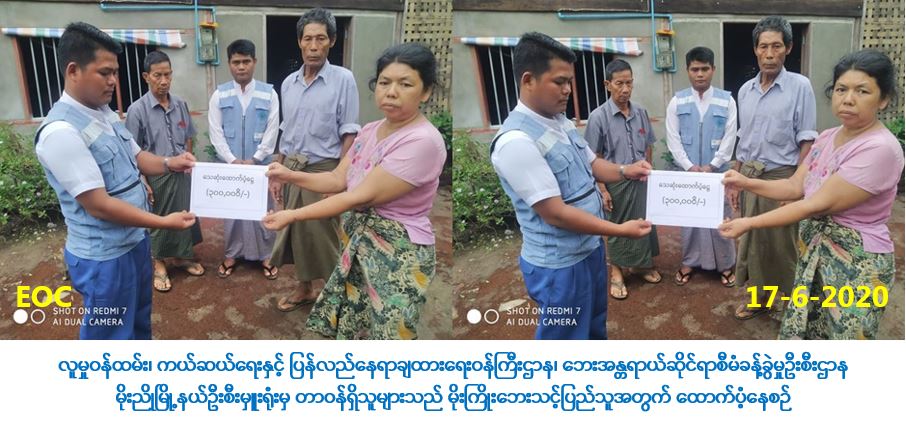 လူမှုဝန်ထမ်း၊ ကယ်ဆယ်ရေးနှင့် ပြန်လည်နေရာချထားရေးဝန်ကြီးဌာန၊ ဘေးအန္တရာယ်ဆိုင်ရာစီမံ ခန့်ခွဲမှုဦးစီးဌာန၊ မိုးညိုမြို့နယ်ဦးစီးမှူးရုံးမှ တာဝန်ရှိသူများသည် (၁၂-၆-၂၀၂၀) ရက်နေ့၌ ပဲခူးတိုင်းဒေသကြီး၊ သာယာဝတီခရိုင်၊ သာယာဝတီမြို့နယ်၊ ကျောင်းစုရပ်ကွက်၊ လွှဇာတုန်း ကျေးရွာတွင် ဖြစ်ပွားခဲ့သော မိုးကြိုးဘေးမှ သေဆုံးသူ(၁)ဦးအတွက် သေဆုံးထောက်ပံ့ငွေ (၃၀၀,၀၀၀/-)ကျပ်၊ စုစုပေါင်းထောက်ပံ့ငွေ (၃၀၀,၀၀၀/-)ကျပ်အား (၁၇-၆-၂၀၂၀)ရက်နေ့ (၁၁း၃၀) နာရီအချိန်တွင် ဘေးသင့်နေအိမ်၌ ကျေးရွာအုပ်ချုပ်ရေးမှူးနှင့်အတူ ပြည်သူလက်ဝယ်အရောက် သွားရောက် ထောက်ပံ့ပေးအပ်ခဲ့ကြောင်း သတင်းရရှိပါသည်။