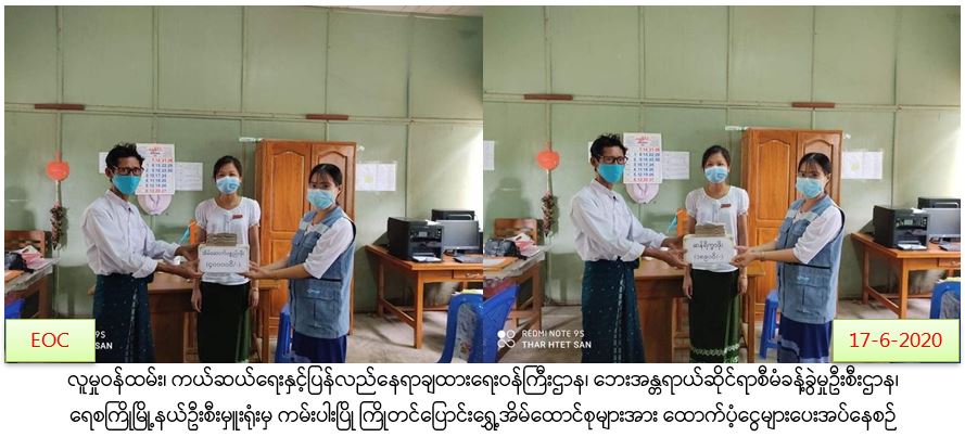 လူမှုဝန်ထမ်း၊ ကယ်ဆယ်ရေးနှင့်ပြန်လည်နေရာချထားရေးဝန်ကြီးဌာန၊ ဘေးအန္တရာယ်ဆိုင်ရာစီမံခန့်ခွဲမှုဦးစီးဌာန၊ ရေစကြိုမြို့နယ်ဦးစီးမှူးရုံးမှ တာဝန်ရှိသူများသည် ရေစကြိုမြို့နယ်၊ ငါးလန်ကျေးရွာအုပ်စု၊ ငါးလန်ကျေးရွာတွင်(၁၇-၆-၂၀၂၀)ရက်နေ့၊ (၀၈:၀၀)အချိန်၌ ဧရာဝတီမြစ်ရေတိုက်စား ကမ်းပါးပြိုကျမှုကြောင့် ကြိုတင်ဖျက်သိမ်းပြောင်းရွှေ့ခြင်းများ ဆောင်ရွက်ခဲ့ကြရာ ကြိုတင်ဖျက်သိမ်းပြောင်းရွှေ့ လူနေအိမ်(၄)လုံး၊အိမ်ထောင်စု(၄)စု၊လူဦးရေ(၉)ဦးတို့အတွက် အိမ်ဆောက်ပစ္စည်းဖိုး(၄၀၀၀၀ဝိ/-)၊ ဆန်ရိက္ခာဖိုး(၁၈၉၀ဝိ/-)၊ စုစုပေါင်းကျပ်(၄၁၈၉၀ဝိ/-)အား (၁၇-၆-၂၀၂၀)ရက်နေ့၊ (၁၅:၀၀)အချိန်တွင် ရေစကြိုမြို့နယ် အထွေထွေအုပ်ချုပ်ရေးရုံး၌ မြို့နယ်အထွေထွေအုပ်ချုပ်ရေးရုံးမှ တာဝန်ရှိသူနှင့်အတူ ကျေးရွာအုပ်ချုပ်ရေးမှူးလက်ဝယ်အရောက် ထောက်ပံ့ပေးအပ်ခဲ့ကြောင်း သတင်းရရှိပါသည်။