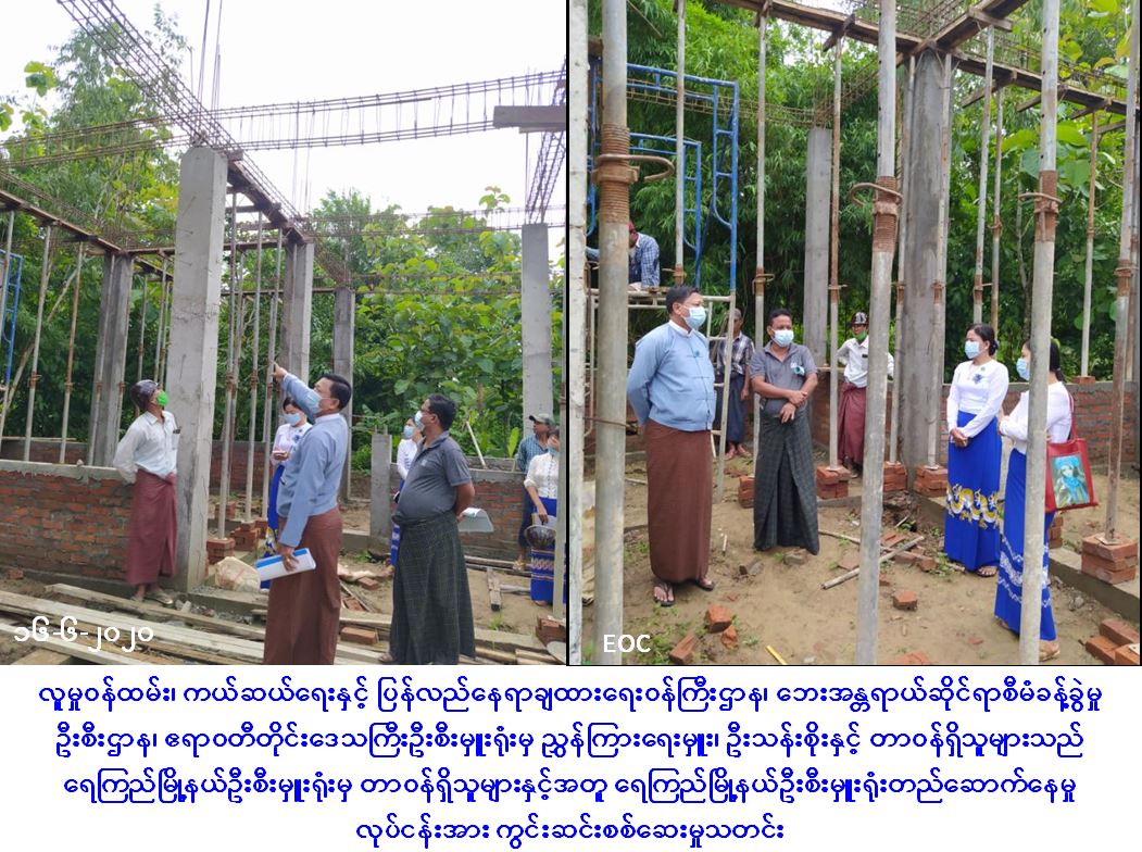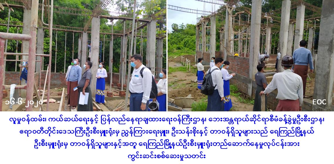 လူမှုဝန်ထမ်း၊ ကယ်ဆယ်ရေးနှင့် ပြန်လည်နေရာချထားရေးဝန်ကြီးဌာန၊ ဘေးအန္တရာယ်ဆိုင်ရာစီမံခန့်ခွဲမှုဦးစီးဌာန၊ ဧရာဝတီတိုင်းဒေသကြီးဦးစီးမှူးရုံးမှ ညွှန်ကြားရေးမှူး၊ ဦးသန်းစိုးနှင့် တာဝန်ရှိသူများသည် ရေကြည်မြို့နယ်ဦးစီးမှူးရုံးမှ တာဝန်ရှိသူများနှင့်အတူ ဝင်းထက်ကျော်ကုမ္ပဏီမှ တာဝန်ယူတည်ဆောက်လျက်ရှိသည့် ရေကြည်မြို့နယ်ဦးစီးမှူးရုံး (၅၀’ x ၄၀’ x ၂၈’) RCC (၂)ထပ် သွပ်မိုး၊ ကွန်ကရစ်ကြမ်းခင်း၊ ရေ၊ မီး၊ မိလ္လာအပါအဝင် ဆောက်လုပ်ခြင်းလုပ်ငန်းအား အရည်အသွေးပြည့်မီစွာ ဆောင်ရွက်နိုင်ရေးအတွက် (၁၆-၆-၂၀၂၀) ရက်နေ့၊ (၀၉:၀၀) နာရီအချိန်တွင် လုပ်ငန်းဆာင်ရွက်နေမှုအခြေအနေအား ကွင်းဆင်းစစ်ဆေးခဲ့ကြောင်း သတင်းရရှိပါသည်။