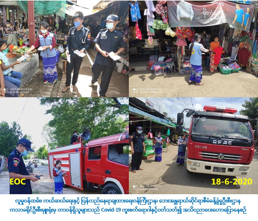 လူမှုဝန်ထမ်း၊ ကယ်ဆယ်ရေးနှင့် ပြန်လည်နေရာချထားရေးဝန်ကြီးဌာန၊ ဘေးအန္တရာယ်ဆိုင်ရာစီမံ ခန့်ခွဲမှုဦးစီးဌာန၊ ကသာခရိုင်ဦးစီးမှူးရုံးမှ တာဝန်ရှိသူများသည် (၁၈-၆-၂၀၂၀) ရက်နေ့တွင် ထီးချိုင့်မြို့၊ အမှတ်(၁)၊ အမှတ်(၂)၊ အမှတ်(၃)၊ အမှတ်(၄)၊ အမှတ်(၅)ရပ်ကွက်များရှိ ပြည်သူများသို့ Covid-19 ကူးစက်ရောဂါနှင့်ပတ်သတ်၍ အသိပညာပေးလုပ်ငန်းများ လှည့်လည်ဆောင်ရွက်ခြင်း၊ မိုးကြိုးဘေးအန္တရာယ်နှင့် ပတ်သတ်၍လည်း ပြည်သူများသို့ အသိပညာလုပ်ငန်းများ လှည့်လည် ဆောင်ရွက်ခြင်းများကို(၀၉း၀၀)နာရီအချိန်မှ (၁၃း၀၀)နာရီအချိန်ထိ ဆောင်ရွက်ခဲ့ပြီး မိုးကြိုးဘေး လက်ကမ်းစာစောင်များကိုလည်း ပြည်သူများသို့ဖြန့်ဝေပေးခဲ့ကြောင်း သတင်းရရှိပါသည်။