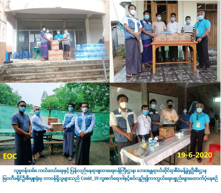 လူမှုဝန်ထမ်း၊ ကယ်ဆယ်ရေးနှင့် ပြန်လည်နေရာချထားရေးဝန်ကြီးဌာန၊ ဘေးအန္တရာယ်ဆိုင်ရာစီမံ ခန့်ခွဲမှုဦးစီးဌာန၊ မြဝတီခရိုင်ဦးစီးမှူးရုံးမှ တာဝန်ရှိသူများသည် (၁၉-၆-၂၀၂၀) ရက်နေ့တွင် မြဝတီမြို့ရှိ ကုန်သွယ်ရေးဇုံ Facility Quarantine Center၊ ရွှေမြဝတီ Facility Quarantine Center၊ မဲကနယ် Facility Quarantine Center၊ ကျောက်လုံးကြီး Facility Quarantine Center၊ သဘာဝတရားရိပ်သာ Facility Quarantine Center၊ ကရင်နှစ်သစ်ကူးကွင်း Facility Quarantine Center တို့အတွက် ဦးစီးဌာနမှ ထောက်ပံ့ပေးသော LUX Soap (၃၀၀၀)တုံးအား ထောက်ပံ့ပေးခဲ့ ကြောင်း သတင်းရရှိပါသည်။