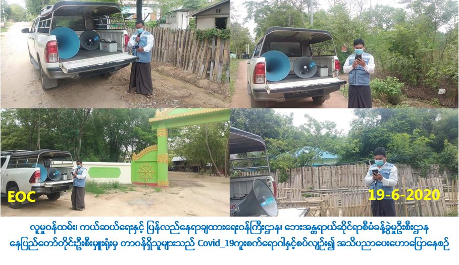 လူမှုဝန်ထမ်း၊ ကယ်ဆယ်ရေးနှင့် ပြန်လည်နေရာချထားရေးဝန်ကြီးဌာန၊ ဘေးအန္တရာယ်ဆိုင်ရာစီမံ ခန့်ခွဲမှုဦးစီးဌာန၊ ပြည်ထောင်စုနယ်မြေ၊ နေပြည်တော်တိုင်းဦးစီးမှူးရုံးနှင့် ဥတ္တရခရိုင်ဦးစီးမှူးရုံးမှ တာဝန်ရှိသူများသည် (၁၉-၆-၂၀၂၀) ရက်နေ့၊ (၁၀:၃၀) နာရီအချိန်မှ (၁၅:၀၀) နာရီအချိန်အထိ ပြည်သူများအား COVID-19 ရောဂါကူးစက်ပြန့်နှံ့မှုများမဖြစ်ပွားစေရန်အတွက် သိရှိလိုက်နာ ဆောင်ရွက်ရမည့် အချက်များနှင့် ပတ်သက်၍ အသိပညာပေးခြင်းကို ပုဗ္ဗသီရိမြို့နယ်၊ ကြို့ပင်သာ ကျေးရွာ၊ ငွေခြံ ကုန်းကျေးရွာ၊ ရန်အောင်ကျေးရွာ၊ ကံသာကျေးရွာနှင့် သံပုရာကုန်းကျေးရွာများရှိ ပြည်သူများသို့ ထိရောက်စွာ လိုက်လံအသိပေးဆောင်ရွက်ခဲ့ကြောင်း သတင်းရရှိပါသည်။