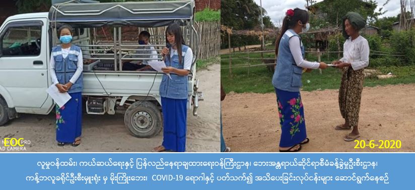 လူမှုဝန်ထမ်း၊ ကယ်ဆယ်ရေးနှင့် ပြန်လည်နေရာချထားရေးဝန်ကြီးဌာန၊ ဘေးအန္တရာယ်ဆိုင်ရာ စီမံခန့်ခွဲမှုဦးစီးဌာန၊ ကန့်ဘလူခရိုင်ဦးစီးမှူးရုံးမှ တာဝန်ရှိသူများသည် (၂၀-၆-၂၀၂၀) ရက်နေ့ (၇:၃၀) နာရီအချိန်မှ စတင်၍ ကန့်ဘလူခရိုင်၊ ကန့်ဘလူမြို့နယ်၊ ကြိုးကြာကျေးရွာအုပ်စု၊ ကြိုးကြာကျေးရွာ၊ ဇီးကုန်းလေးကျေးရွာ၊ မင်းကုန်း(ခ)ကျေးရွာ၊ ထန်းတောကျေးရွာ၊ ခေါ်သန္တီ ကျေးရွာအုပ်စု၊ ခေါ်သန္တီကျေးရွာ၊ မိုးကြိုးကျေးရွာ၊ ထန်းကုန်းကျေးရွာအုပ်စု၊ ထန်းကုန်းကျေးရွာ၊ ဇီးပင်သာကျေးရွာ၊ ဉာဏ်အင်းကျေးရွာနှင့် ရဲဒွေးကျေးရွာများရှိ ပြည်သူများထံသို့ သွားရောက်ပြီး မိုးကြိုးဘေး၊ COVID-19ရောဂါတို့နှင့် ပတ်သတ်၍ အသိပေးနှိုးဆော်ခြင်းလုပ်ငန်းများ ဆောင်ရွက် ခဲ့ပြီး မိုးကြိုးဘေး လက်ကမ်းစာစောင်များလည်း ဖြန့်ဝေခဲ့ပါကြောင်း သတင်းရရှိပါသည်။