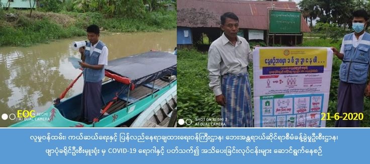 လူမှုဝန်ထမ်း၊ ကယ်ဆယ်ရေးနှင့် ပြန်လည်နေရာချထားရေးဝန်ကြီးဌာန၊ ဘေးအန္တရာယ်ဆိုင်ရာ စီမံခန့်ခွဲမှုဦးစီးဌာန၊ ဖျာပုံခရိုင်ဦးစီးမှူးရုံးမှ တာဝန်ရှိသူများသည် (၂၁- ၆ -၂၀၂၀) ရက်နေ့ နံနက် (၉:၃၀) နာရီအချိန်မှ ညနေ (၁၅:၃၀) နာရီအချိန်အထိ ပြည်သူများအား COVID-19 ရောဂါ ကူးစက်ပြန့်နှံ့မှုများ မဖြစ်ပွားစေရန်အတွက် သိရှိလိုက်နာ ဆောင်ရွက်ရမည့်အချက်များနှင့် ပတ်သက်၍ အသိပညာပေးခြင်းကို ဖျာပုံမြို့နယ်၊ သုံးထပ်ကျေးရွာအုပ်စု၊သုံး ထပ်ကျေးရွာ၊ ညောင်တစ်ပင်ကျေးရွာ၊ ထိန်ဝိုင်းကျေးရွာ၊ အဇုတ်ကလေးကျေးရွာ၊ ဖိုးရှမ်းစုကျေးရွာရှိ ပြည်သူများသို့ ထိရောက်စွာ လိုက်လံအသိပေးဆောင်ရွက်ခဲ့ခြင်းနှင့် အသိပညာပေးဗီနိူင်းပိုစတာပေးအပ်ခဲ့ပါကြောင်း သတင်းရရှိပါသည်။
