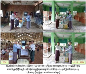 လူမှုဝန်ထမ်း၊ ကယ်ဆယ်ရေးနှင့်ပြန်လည်နေရာချထားရေးဝန်ကြီးဌာန၊ ဘေးအန္တရာယ်ဆိုင်ရာစီမံခန့်ခွဲမှုဦးစီးဌာန၊ ကျောက်ဖြူခရိုင်ဦးစီးမှူးရုံးမှ တာဝန်ရှိသူများသည် အမ်းမြို့နယ်၊ ဒုက္ကံကျေးရွာဘက်စုံသုံးခန်းမ၊ ကဇုကိုင်းကျေးရွာ၊ ကိုးကန်တန်းကျေးရွာနှင့် အောက်ရွာကျေးရွာတိုက်ပွဲရှောင်စုရပ် (၄) စုအတွက် COVID- 19 ကြိုတင်ကာကွယ်ရေးပစ္စည်းများဖြစ်သည့် ဆပ်ပြာ(၅၂၈) တောင့်၊ Surgical Mask (၅၂၈) ခု၊ Hand Gel (၇၁) ဗူး၊ လက်ဆေးဘေစင်(ရေပုံးအပါအဝင်) (၄) စုံ၊ ထုံး (၅ ပိဿာပါ)(၁၀) အိတ်၊ လမ်းညွှန်ဗီနိုင်း (၁)ချပ်တို့ကို (၂၂.၆.၂၀၂၀)ရက်နေ့ နေ့လယ်(၁၃း၀၀)အချိန်တွင် အမ်းမြို့နယ်အထွေထွေအုပ်ချုပ်ရေးဦးစီးဌာနသို့ လွှဲပြောင်း၍လည်းကောင်း၊ စျေးတောင်ရပ်ကွက်တိုက်ပွဲရှောင်စုရပ်နှင့် မိုးလုံလေလုံအားကစားခန်းမအတွက် ဆပ်ပြာ(၇၇၃)တောင့်၊ Surgical Mask(၇၇၃)ခု၊ Hand Gel(၆၀)ဗူး၊ လက်ဆေးဘေစင်(ရေပုံးအပါအဝင်) (၂) စုံ၊ ထုံးအိတ်(၅ ပိဿာပါ) (၂၀)အိတ်၊ လမ်းညွှန်ဗီနိုင်း (၂)ချပ်တို့အား (၁၃း၃၀) အချိန်တွင် တိုက်ပွဲရှောင်ပြည်သူများထံ လက်ဝယ်အရောက်သွားရောက်၍လည်းကောင်း ထောက်ပံ့ပေးအပ်ခဲ့ကြောင်း သတင်းရရှိပါသည်။