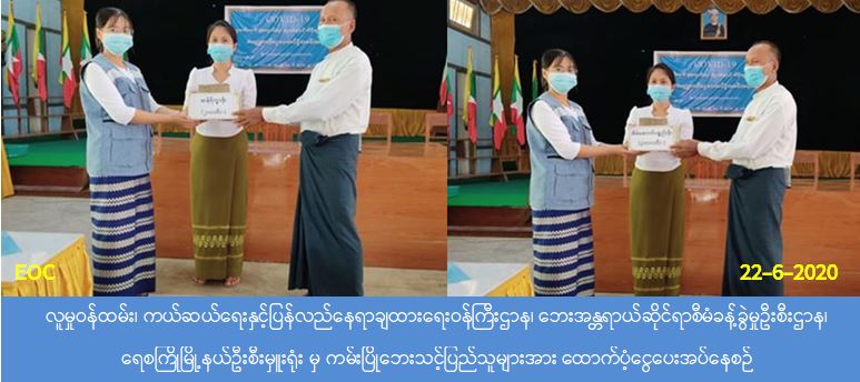 လူမှုဝန်ထမ်း၊ ကယ်ဆယ်ရေးနှင့်ပြန်လည်နေရာချထားရေးဝန်ကြီးဌာန၊ ဘေးအန္တရာယ်ဆိုင်ရာ စီမံခန့်ခွဲမှုဦးစီးဌာန၊ ရေစကြိုမြို့နယ်ဦးစီးမှူးရုံးမှ တာဝန်ရှိသူများသည် ရေစကြိုမြို့နယ်၊ မိုးကွဲ ကျေးရွာအုပ်စု၊ ချင်းယားကျေးရွာတွင် (၂၂-၆-၂၀၂၀) ရက်နေ့၊ (၀၉:၀၀) နာရီအချိန်၌ ချင်းတွင်း မြစ်ရေတိုက်စားကမ်းပါးပြိုကျမှုကြောင့် ကြိုတင်ဖျက်သိမ်းပြောင်းရွှေ့ခြင်းများ ဆောင်ရွက်ခဲ့ကြ ရာ ကြိုတင်ဖျက်သိမ်းပြောင်းရွှေ့လူနေအိမ် (၃) လုံး၊ အိမ်ထောင်စု (၃) စု၊ လူဦးရေ(၁၀) ဦး တို့အတွက် အိမ်ဆောက်ပစ္စည်းဖိုးထောက်ပံ့ငွေ (၃၀၀,၀၀၀/-) ကျပ်၊ ဆန်ရိက္ခာဖိုးထောက်ပံ့ငွေ (၂၁,၀၀၀/-) ကျပ်၊ စုစုပေါင်းထောက်ပံ့ငွေ (၃၂၁,၀၀၀/-) ကျပ်အား (၂၂-၆-၂၀၂၀) ရက်နေ့၊ (၁၅:၀၀) နာရီအချိန်တွင် ရေစကြိုမြို့နယ်အထွေထွေအုပ်ချုပ်ရေးရုံး၌ မြို့နယ်အထွေထွေအုပ် ချုပ်ရေးရုံးမှ တာဝန်ရှိသူနှင့်အတူ ကျေးရွာအုပ်ချုပ်ရေးမှူးလက်ဝယ်အရောက် ထောက်ပံ့ပေးအပ်ခဲ့ ပါကြောင်း သတင်းရရှိပါသည်။