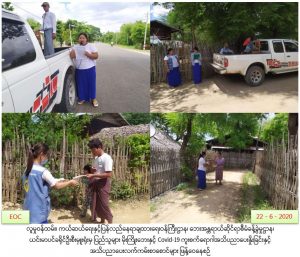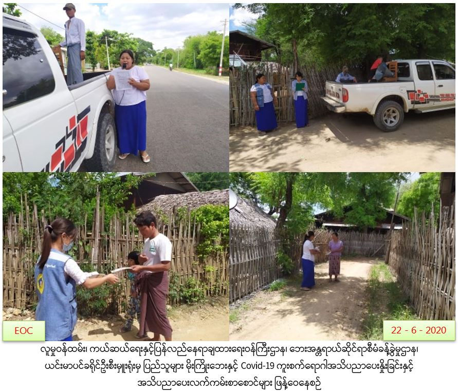 လူမှုဝန်ထမ်း၊ ကယ်ဆယ်ရေးနှင့် ပြန်လည်နေရာချထားရေးဝန်ကြီးဌာန၊ ဘေးအန္တရာယ်ဆိုင်ရာစီမံခန့်ခွဲမှုဦးစီးဌာန၊ ယင်းမာပင်ခရိုင်ဦးစီးမှူးရုံးမှ တာဝန်ရှိသူများသည် (၂၂-၆-၂၀၂၀) ရက်နေ့တွင် ယင်းမာပင်မြို့နယ်အတွင်းရှိ ရွာထောင်ကျေးရွာ၊ လေးရွာကျေးရွာ၊ မြေကျက်ဆူကျေးရွာ၊ မြို့ကြီးကျေးရွာ၊ နှုံးကြီးကျေးရွာ၊ မြောက်နှုံးကျေးရွာများရှိ ပြည်သူများထံသို့ သွားရောက်ပြီး မိုးကြိုးဘေး၊ COVID-19ရောဂါတို့နှင့် ပတ်သတ်၍ အသိပေးနှိုးဆော်ခြင်းလုပ်ငန်းများ ဆောင်ရွက်ခဲ့ပြီး မိုးကြိုးဘေး လက်ကမ်းစာစောင်များလည်း ဖြန့်ဝေခဲ့ကြောင်း သတင်းရရှိပါသည်။