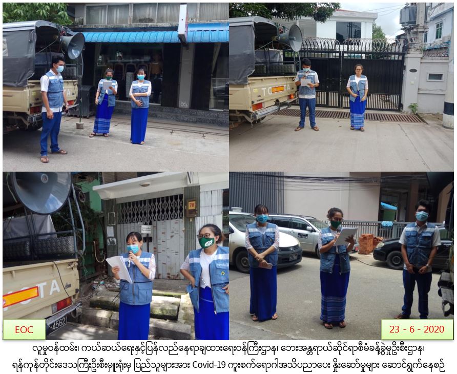 လူမှုဝန်ထမ်း၊ ကယ်ဆယ်ရေးနှင့်ပြန်လည်နေရာချထားရေးဝန်ကြီးဌာန၊ ဘေးအန္တရာယ်ဆိုင်ရာစီမံခန့်ခွဲမှုဦးစီးဌာန၊ ရန်ကုန်တိုင်းဒေသကြီးဦးစီးမှူးရုံးမှ (၂၃-၆-၂၀၂၀)ရက်နေ့တွင် ရန်ကုန်အနောက်ပိုင်းခရိုင်၊ ကမာရွတ်မြို့နယ်၊ အမှတ်(၁/၂/၃/၄/၅)ရပ်ကွက်တို့တွင် Covid-19 ကူးစက်ရောဂါနှင့်ပတ်သက်၍ အများပြည်သူများ သိရှိလိုက်နာနိုင်ရန် ကျန်းမာရေးနှင့်အားကစားဝန်ကြီးဌာနမှ ထုတ်ပြန်ထားသောအသိပညာပေးကြေငြာချက်များအား နှိုးဆော်မှုများ ဆောင်ရွက်ခဲ့ကြောင်း သတင်းရရှိပါသည်။