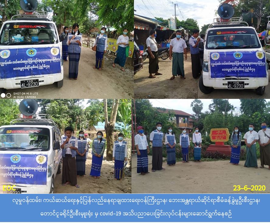 လူမှုဝန်ထမ်း၊ ကယ်ဆယ်ရေးနှင့် ပြန်လည်နေရာချထားရေးဝန်ကြီးဌာန၊ ဘေးအန္တရာယ်ဆိုင်ရာ စီမံခန့်ခွဲမှုဦးစီးဌာန၊ တောင်ငူခရိုင်ဦးစီးမှူးရုံးမှ တာဝန်ရှိသူများသည် (၂၃-၆-၂၀၂၀) ရက်နေ့၌ အုတ်တွင်မြို့နယ်၊ အင်ဒိုင်းကျေးရွာအုပ်စု၊ အင်ဒိုင်းကျေးရွာ၊ တဲကြီးကျေးရွာ၊ ကျောက်တလင်း ကျေးရွာ၊ ကျောက်ရှစ်ဆယ်ကျေးရွာအုပ်စု၊ ကျောင်းရှစ်ဆယ်ကျေးရွာနှင့် ဖြူးမြို့နယ်၊ ကျား သောင်ကျေးရွာအုပ်စု၊ ကျားသောင်ရွာ၊ ဇီးခုန်ကျေးရွာအုပ်စု၊ ဇီးခုန်ကျေးရွာ၊ မြို့ချောင်းကျေးရွာ၊ ဦးရုံးစုကျေးရွာ၊ တံခွန်တိုင်ကျေးရွာအုပ်စု၊ တံခွန်တိုင်(၁) ကျေးရွာ၊ တံခွန်တိုင်(၂) ကျေးရွာ ညောင်ပင်သာကျေးရွာ တို့တွင် COVID-19 ရောဂါနှင့် ပက်သက်သည့်ဆောင်ရန်၊ ရှောင်ရန်များ အသိပညာပေးဆောင်ရွက်ခဲ့ပါကြောင်းသတင်းရရှိပါသည်။
