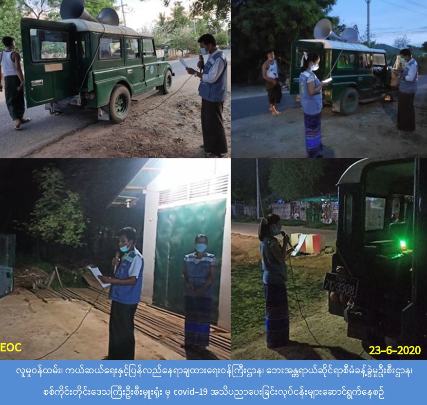 လူမှုဝန်ထမ်း၊ ကယ်ဆယ်ရေးနှင့် ပြန်လည်နေရာချထားရေးဝန်ကြီးဌာန၊ ဘေးအန္တရာယ်ဆိုင်ရာ စီမံခန့်ခွဲမှုဦးစီးဌာန၊ စစ်ကိုင်းတိုင်းဒေသကြီးဦးစီးမှူးရုံးမှ တာဝန်ရှိသူများသည် (၂၃-၆-၂၀၂၀) ရက်နေ့တွင် စစ်ကိုင်းတိုင်းဒေသကြီး၊ မုံရွာမြို့နယ်အတွင်းရှိ နန္ဒဝင်ရပ်၊ နယ်မြေ (၁)၊ နယ်မြေ (၂)၊ နယ်မြေ(၃)၊ နယ်မြေ(၄)၊ နယ်မြေ(၅)၊ နယ်မြေ(၆)၊ နယ်မြေ(၇) များတွင် Covid-19 ရောဂါကူးစက်ပျံ့နှံမှုများ မဖြစ်ပွားစေနိုင်ရန်အတွက် အများပြည်သူများ အလွယ်တကူသိရှိ လိုက်နာဆောင်ရွက်ရန်များကို အသိပေးဆောင်ရွက်ခြင်း လုပ်ငန်းများကို ဆောင်ရွက်ခဲ့ပါ ကြောင်း သတင်းပေးရရှိပါသည်။