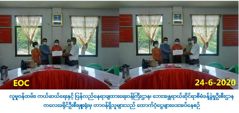 လူမှုဝန်ထမ်း၊ ကယ်ဆယ်ရေးနှင့် ပြန်လည်နေရာချထားရေးဝန်ကြီးဌာန၊ ဘေးအန္တရာယ် ဆိုင်ရာစီမံခန့်ခွဲမှုဦးစီးဌာန၊ ကလေးခရိုင်ဦးစီးမှူးရုံးမှ တာဝန်ရှိသူများသည် (၂၄-၆-၂၀၂၀) ရက်နေ့၊ (၁၁း၀၀)နာရီအချိန်တွင် စစ်ကိုင်းတိုင်းဒေသကြီး၊ ကလေးခရိုင်၊ ကလေးမြို့၊ မင်္ဂလာဥယျာဥ်ရပ်ကွက်၊ သံတံတားချောင်းအတွင်း အမှိုက်များပိတ်ဆို့မှုကြောင့် ချောင်းဘေး ဝဲယာရှိ လယ်ဧက(၁၀၀)ကျော်သည် ရေရရှိရန် အခက်အခဲ ဖြစ်ပေါ်လျက်ရှိသည့်အတွက် ယင်းချောင်းအတွင်းရှိ အမှိုက်များဖယ်ရှားပြီး ရွှံ့နွံများအား တူးဖော်ရန် လိုအပ်သည့် စက်သုံးဆီဖိုး(၆၀၀,၀၀၀/-)ကျပ်နှင့် စက်ငှားရမ်းခ (၁,၄၀၀,၀၀၀/-) ကျပ်၊ စုစုပေါင်း (၂,၀၀၀,၀၀၀/-)ကျပ်အား ကလေးမြို့နယ် ပြည်သူ့လွှတ်တော်ကိုယ်စားလှယ်၊ ကလေး မြို့နယ်၊ တိုင်းဒေသကြီး လွှတ်တော်ကိုယ်စားလှယ်နှင့်အတူ ကလေးမြို့နယ်၊ အထွေထွေ အုပ်ချုပ်ရေးဦးစီးဌာန အစည်းအဝေးခန်းမ၌ မင်္ဂလာဥယျာဥ်ရပ်ကွက်အုပ်ချုပ်ရေးမှူးနှင့် တောင်သူများသို့ ထောက်ပံ့ပေးအပ်ခဲ့ကြောင်း သတင်းရရှိပါသည်။