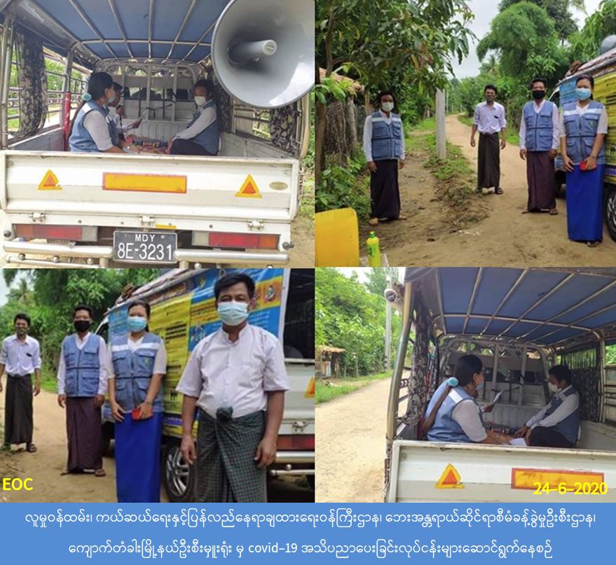 လူမှုဝန်ထမ်း၊ ကယ်ဆယ်ရေးနှင့် ပြန်လည်နေရာချထားရေးဝန်ကြီးဌာန၊ ဘေးအန္တရာယ်ဆိုင်ရာ စီမံခန့်ခွဲမှုဉီးစီးဌာန၊ ကျောက်တံခါးမြို့နယ်စီးမှူးရုံးမှ တာဝန်ရှိသူများသည် ကျောက်တံခါးမြို့ နယ်အတွင်းရှိ ဇရပ်ခင်ရွာဟောင်းကျေးရွာ၊ ဇရပ်ခင်ရွာသစ်ကျေးရွာ၊ သဲဖြူရွာဟောင်းကျေးရွာ သဲဖြူရွာသစ်ကျေးရွာအောက်တဲစုကျေးရွာနှင့် ပဲနွယ်ကုန်းမြို့ကမ္ဘောဇရပ်ကွက်၊ သံမဏိရပ်ကွက် တို့တွင်(၂၄-၆-၂၀၂၀) ရက်နေ့နံနက် (၁၀.၀၀) နာရီအချိန်မှစတင်၍ COVID-19 ကူးစက် ရောဂါ နှင့်ပတ်သက်ပြီး ဆောင်ရန်/ ရှောင်ရန်များကို ကျေးရွာနေပြည်သူတို့အား အသိပညာပေးခြင်း များဆောင်ရွက်ခဲ့ပါကြောင်း သတင်းရရှိပါသည်။