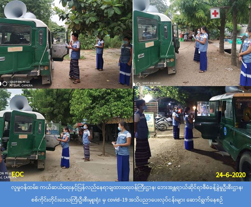 လူမှုဝန်ထမ်း၊ ကယ်ဆယ်ရေးနှင့်ပြန်လည်နေရာချထားရေးဝန်ကြီးဌာန၊ ဘေးအန္တရာယ်ဆိုင်ရာ စီမံခန့်ခွဲမှုဦးစီးဌာန၊ စစ်ကိုင်းတိုင်းဒေသကြီးဦးစီးမှူးရုံးမှ တာဝန်ရှိသူများသည် (၂၄-၆-၂၀၂၀) ရက်နေ့၊ ညနေ (၀၆:၀၀) နာရီအချိန်မှစ၍ မုံရွာမြို့၊ သလ္လာအမှတ် (၁) ရပ်ကွက်မှ အမှတ်(၁၀) ရပ်ကွက်အထိ Covid-19 အသက်ရှူလမ်းကြောင်းဆိုင်ရာရောဂါနှင့် ပတ်သက်၍ ကျန်းမာရေး နှင့်အားကစားဝန်ကြီးဌာနမှ ထုတ်ပြန်ထားသည့် အသိပေးကြေညာချက်များအား အများပြည် သူများ သိရှိလိုက်နာရန် ကွင်းဆင်း၍ အသိပညာပေးခြင်းများ ဆောင်ရွက်ခဲ့ပါကြောင်း သတင်း ရရှိပါသည်။