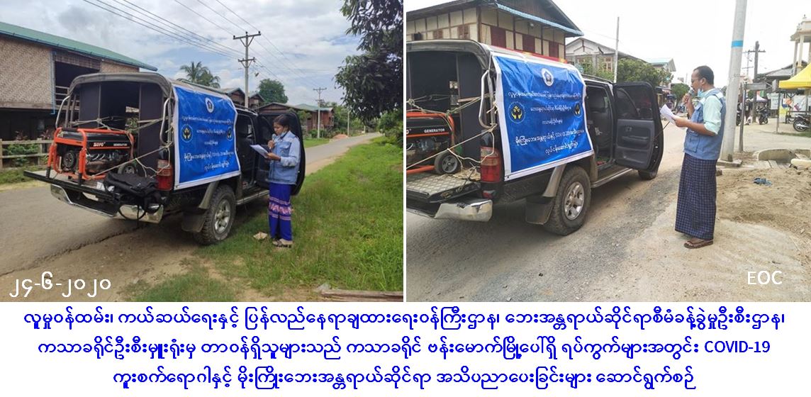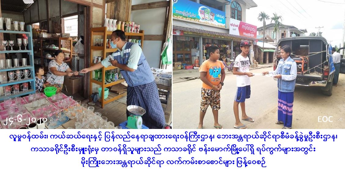 လူမှုဝန်ထမ်း၊ ကယ်ဆယ်ရေးနှင့် ပြန်လည်နေရာချထားရေးဝန်ကြီးဌာန၊ ဘေးအန္တရာယ်ဆိုင်ရာစီမံခန့်ခွဲမှုဦးစီးဌာန၊ ကသာခရိုင်ဦးစီးမှူးရုံးမှ တာဝန်ရှိသူများသည် (၂၄-၆-၂၀၂၀) ရက်နေ့တွင် ကသာခရိုင်၊ ဗန်းမောက်မြို့ပေါ်ရှိ ရပ်ကွက်များဖြစ်သော အောင်သာကုန်းရပ်ကွက်၊ မြို့မရပ်ကွက်၊ လွှစင်ကုန်းရပ်ကွက်၊ မြနန္ဒာရပ်ကွက်၊ စက်တောကျေးရွာ၊ လယ်နက်ကြီးကျေးရွာ၊ နားယကာကျေးရွာ၊ ခမိုးကျေးရွာတို့တွင် ပြည်သူများသို့ Covid-19 ရောဂါကူးစက်ပျံ့နှံ့မှုမဖြစ်ပွားစေရန် သိရှိလိုက်နာဆောင်ရွက်ရန်အချက်များအား အသိပညာပေးခြင်း၊ မိုးကြိုးဘေးအန္တရာယ်နှင့်ပတ်သက်၍ အသိပညာပေးခြင်းနှင့် လက်ကမ်းစာစောင်များဖြန့်ဝေခြင်းတို့ကို ဆောင်ရွက်ခဲ့ကြောင်း သတင်းရရှိပါသည်။