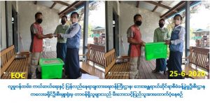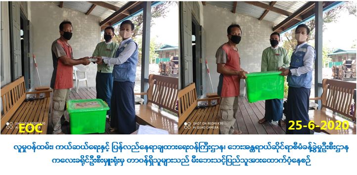လူမှုဝန်ထမ်း၊ ကယ်ဆယ်ရေးနှင့် ပြန်လည်နေရာချထားရေးဝန်ကြီးဌာန၊ ဘေးအန္တရာယ် ဆိုင်ရာစီမံခန့်ခွဲမှုဦးစီးဌာန၊ ကလေးခရိုင်ဦးစီးမှူးရုံးမှ တာဝန်ရှိသူများသည်(၂၃-၆-၂၀၂၀) ရက်နေ့၊ (၁၅း၅၂)နာရီအချိန်တွင် ကလေးမြို့၊ မြို့လှရပ်ကွက်၊ နယ်မြေ(၁၀)၌ ဖြစ်ပွားသော မီးဘေးသင့်အိမ်ခြေ(၁)လုံး၊ လူဦးရေ(၆)ဦးအတွက် ဆန်ရိက္ခာဖိုးထောက်ပံ့ငွေ(၁၂,၆၀၀/-) ကျပ်၊ အိမ်ဆောက်ပစ္စည်းဖိုးထောက်ပံ့ငွေ (တစ်စိတ်တစ်ပိုင်း) (၁၀၀,၀၀၀/-)ကျပ်၊ စုစုပေါင်း ထောက်ပံ့ငွေ (၁၁၂,၆၀၀) ကျပ်နှင့် Family Kits (၁)ပုံးအား (၂၅-၆-၂၀၂၀)ရက်နေ့၊ (၁၂း၀၀)နာရီအချိန်တွင် အဆိုပါမီးဘေးသင့်နေအိမ်သို့ သွားရောက်ထောက်ပံ့ပေးအပ်ခဲ့ ကြောင်း သတင်းရရှိပါသည်။