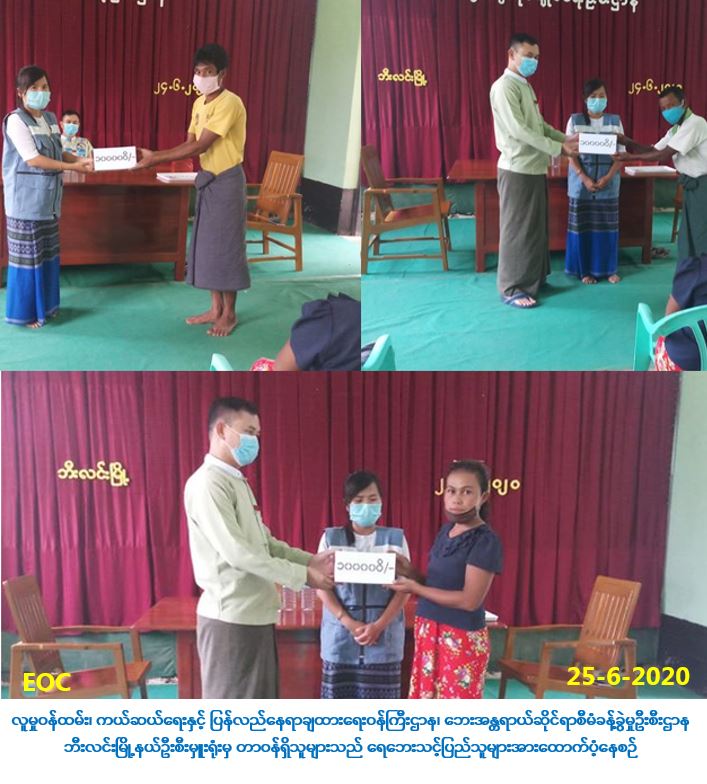လူမှုဝန်ထမ်း၊ ကယ်ဆယ်ရေးနှင့် ပြန်လည်နေရာချထားရေးဝန်ကြီးဌာန၊ ဘေးအန္တရာယ် ဆိုင်ရာစီမံခန့်ခွဲမှုဦးစီးဌာန၊ ဘီးလင်းမြို့နယ်ဦးစီးမှူးရုံးမှ တာဝန်ရှိသူများးသည် (၂၅-၆-၂၀၂၀) ရက်နေ့၊ (၁၃:၀၀)နာရီအချိန်တွင် မိုးတွင်းကာလ နှစ်စဥ် ဘီးလင်းမြစ်ရေဝင်ရောက်မှုကြောင့် ရေဘေးကြုံတွေ့ခံစားနေရသည့် ဘီးလင်းမြို့နယ်၊ ဘိုးရာဇာရပ်ကွက်မှ ထပ်မံကြိုတင် ပြောင်းရွေ့ နေအိမ်(၉)လုံး၊ အိမ်ထောင်စု(၉)စုတို့အတွက် အိမ်ထောင်စု(၁)စုလျှင် အိမ်ဆောက်ပစ္စည်းဖိုးထောက်ပံ့ငွေ(၁၀၀,၀၀ဝိ/-)ကျပ်နှုန်းဖြင့် စုစုပေါင်း (၉၀၀,၀၀ဝိ/-)ကျပ် အား မြို့နယ်အုပ်ချုပ်ရေးမှူးနှင့်အတူ ဘီးလင်းမြို့နယ်အထွေထွေအုပ်ချုပ်ရေးဦးစီးဌာန အစည်းအဝေးခန်းမ၌ ထောက်ပံ့ပေးအပ်ခဲ့ကြောင်း သတင်းရရှိပါသည်။
