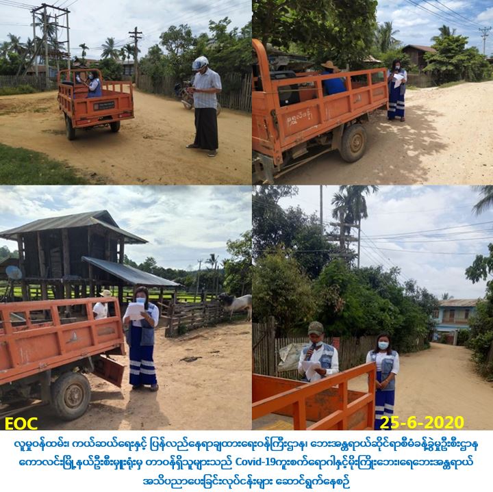 လူမှုဝန်ထမ်း၊ ကယ်ဆယ်ရေးနှင့် ပြန်လည်နေရာချထားရေးဝန်ကြီးဌာန၊ ဘေးအန္တရာယ် ဆိုင်ရာစီမံခန့်ခွဲမှုဦးစီးဌာန၊ ကောလင်းမြို့နယ်ဦးစီးမှူးရုံးမှ(၂၅-၆-၂၀၂၀)ရက်နေ့တွင် ကောလင်းမြို့နယ် စွယ်ရေကျးရွာ၊ ဇင်ပြွန်းချောင်းကျေးရွာ၊ ရှောက်ပင်ဝိုင်းကျေးရွာ၊ မုတ်ဝေကျးရွာ၊ ချပ်ကုန်းကျေးရွာသို့ Covid-19ကူးစက်ရောဂါနှင့် မိုးကြိုးဘေး၊ ရေဘေးတို့နှင့်ပတ်သတ်သော ဆောင်ရန်/ရှောင်ရန်များ အား အသိပညာပေးဆောင်းရွက်ခဲ့ ကြောင်း သတင်းရရှိပါသည်။
