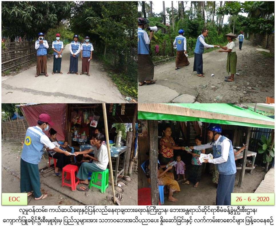 လူမှုဝန်ထမ်း၊ ကယ်ဆယ်ရေးနှင့်ပြန်လည်နေရာချထားရေးဝန်ကြီးဌာန၊ ဘေးအန္တရာယ်ဆိုင်ရာစီမံခန့်ခွဲမှုဦးစီးဌာန၊ ကျောက်ဖြူခရိုင်ဦးစီးမှူးရုံးမှ တာဝန်ရှိသူများသည်(၂၆-၆-၂၀၂၀)ရက်နေ့ညနေ (၁၄း၀၀)အချိန်မှ (၁၆း၀၀)အချိန်အထိ ကျောက်ဖြူမြို့၊ င/လပွေ့ရပ်ကွက်နှင့် ပြင်ဖြူမော်ရပ်ကွက်တို့တွင် မုန်တိုင်းဘေး၊ မိုးကြိုးဘေး၊ ရေဘေးတို့နှင့် ပတ်သက်၍ ပြည်သူလူထုမှ သိရှိလိုက်နာဆောင်ရွက်နိုင်ရန် ဆောင်ရန်/ရှောင်ရန် အချက်များအား Hand Speaker ဖြင့်လိုက်လံနှိုးဆော်ခြင်း၊ လက်ကမ်းစာစောင်များဖြန့်ဝေခြင်းတို့ကို ဆောင်ရွက်ခဲ့ကြောင်း သတင်းရရှိပါသည်။