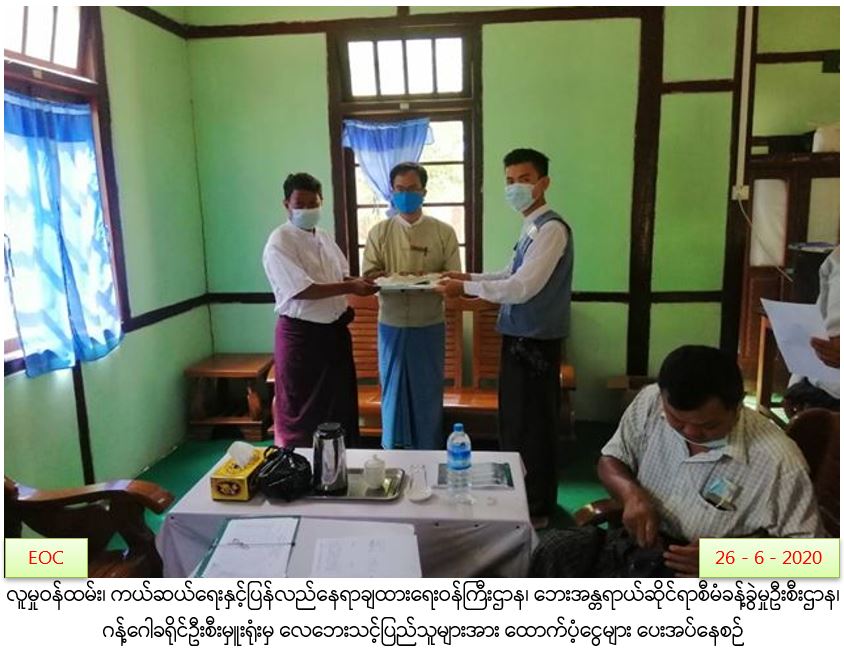 လူမှုဝန်ထမ်း၊ ကယ်ဆယ်ရေးနှင့်ပြန်လည်နေရာချထားရေးဝန်ကြီးဌာန၊ ဘေးအန္တရာယ်ဆိုင်ရာစီမံခန့်ခွဲမှုဦးစီးဌာန၊ ဂန့်ဂေါခရိုင်ဦးစီးမှူးရုံးမှ တာဝန်ရှိသူများသည် ဂန့်ဂေါခရိုင်၊ ထီးလင်းမြို့နယ်၊ ၀က်သက်ရွာမကျေးရွာတွင် (၂၄-၆-၂၀၂၀)ရက်နေ့ ၁၅း၃၀)နာရီမှ (၁၆:၁၅)နာရီအချိန်ထိ လေပြင်းတိုက်ခတ်မှုကြောင့် အမိုးလန်ဘုန်းကြီး ကျောင်း(၁)ကျောင်း၊ အမိုးလန်နေအိမ်(၆)လုံး၊ အိမ်ထောင်စု(၆)စု၊ လူဦးရေ(၂၉)ဦးတို့အတွက် ကျောင်းဆောက်ပစ္စည်းဖိုး (၁၀၀၀၀ဝိ/-)၊ အိမ်ဆောက်ပစ္စည်းဖိုး (၁၅၀၀၀ဝိ/-)၊ ဆန်ရိက္ခာဖိုး(၆၀၉၀ဝိ/-)၊ စုစုပေါင်း(၃၁၀၉၀ဝိ/-)အား ထီးလင်းမြို့ နယ်အထွေထွေအုပ်ချုပ်ရေးဦးစီးဌာနမှ ဒုတိယမြို့နယ်အုပ်ချုပ်ရေးမှူး၏ရှေ့ မှောက်၌ လေဘေးသင့်ပြည်သူထံသို့ (၂၆-၆-၂၀၂၀)ရက်နေ့ (၁၀:၃၀)နာရီ အချိန်၌ ထောက်ပံ့ပေးအပ်ခဲ့ကြောင်း သတင်းရရှိပါသည်။