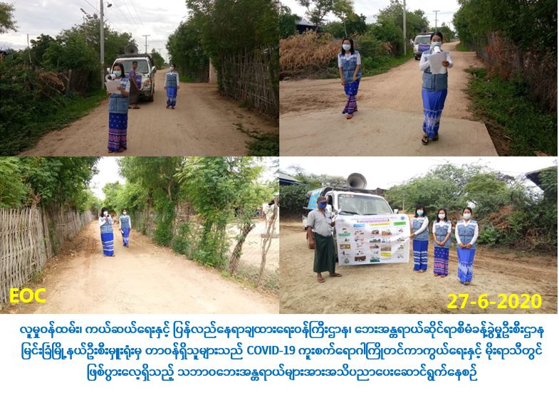 လူမှုဝန်ထမ်း၊ ကယ်ဆယ်ရေးနှင့် ပြန်လည်နေရာချထားရေးဝန်ကြီးဌာန၊ ဘေးအန္တရာယ် ဆိုင်ရာစီမံခန့်ခွဲမှုဦးစီးဌာန၊ မြင်းခြံမြို့နယ်ဦးစီးမှူးရုံးမှ တာဝန်ရှိသူ များသည် (၂၇-၆-၂၀၂၀) ရက်နေ့ (ဝ၇:၃၀)နာရီအချိန်မှ စတင်ပြီး မြင်းခြံမြို့နယ်အတွင်းရှိ ရပ်ကွက်(၇)ရပ်ကွက်နဲ့ ကျေးရွာ(၁၂)ရွာသို့ လှည့်လည်ပြီး COVID-19 ကူးစက်ရောဂါကြိုတင်ကာကွယ်ရေးနှင့် မိုးရာသီတွင် ဖြစ်ပွားလေ့ရှိသည့် သဘာဝဘေးအန္တရာယ်များကို ကြိုတင်ပြင်ဆင်ရေး နှင့်ပတ်သက်၍ ပြည်သူလူထုသို့ အသိပေးနှိုးဆော်ခြင်းများနှင့် ဗီနိုင်းပိုစတာပေးအပ်ခြင်းများ ဆောင်ရွက်ခဲ့ကြောင်း သတင်းရရှိပါသည်။