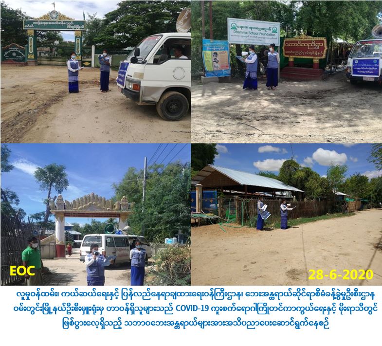 လူမှုဝန်ထမ်း၊ ကယ်ဆယ်ရေးနှင့် ပြန်လည်နေရာချထားရေးဝန်ကြီးဌာန၊ ဘေးအန္တရာယ် ဆိုင်ရာစီမံခန့်ခွဲမှုဦးစီးဌာန၊ ဝမ်းတွင်းမြို့နယ်ဦးစီးမှူရုံးမှ တာဝန်ရှိသူများသည် (၂၆-၆-၂၀၂၀) ရက်နေ့မှ (၂၈-၆-၂၀၂၀) ရက်နေ့အထိ မြို့နယ်အတွင်းရှိကျေးရွာများ၌ ပြည်သူများအား Covid-19 ကူးစက်ရောဂါအသိပညာပေးခြင်း၊ ပိုစတာများဖြန့်ဝေခြင်းနှင့် မိုးကြိုးဘေး အသိပညာပေးခြင်းများကို ကွင်းဆင်းဆောင်ရွက်ခဲ့ကြောင်း သတင်းရရှိပါသည်။