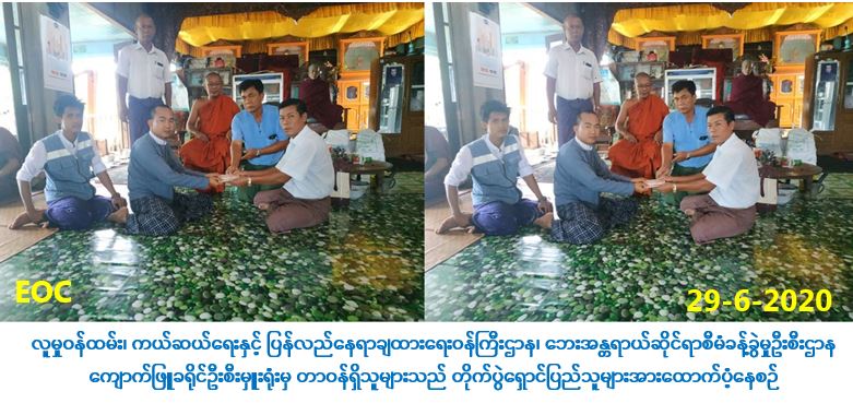 လူမှုဝန်ထမ်း၊ ကယ်ဆယ်ရေးနှင့် ပြန်လည်နေရာချထားရေးဝန်ကြီးဌာန၊ ဘေးအန္တရာယ် ဆိုင်ရာစီမံခန့်ခွဲမှုဦးစီးဌာန၊ ကျောက်ဖြူခရိုင်ဦးစီးမှူးရုံးမှ တာဝန်ရှိသူများသည် (၂၈-၆-၂၀၂၀) ရက်နေ့တွင် ကျောက်ဖြူမြို့နယ်၊ စေတီတောင်ရပ်ကွက်၊ ပရဟိတဘုန်းတော်ကြီးကျောင်းသို့ ရောက်ရှိလာသည့် တိုက်ပွဲရှောင်အိမ်ထောင်စု (၁၉)စု၊ လူဦးရေ (၇၈) ဦးတို့အတွက် ဆန်ရိက္ခာ(၂) ပတ်စာဖိုးထောက်ပံ့ငွေ (၃၂၇,၆၀၀/-) ကျပ်အား (၂၉-၆-၂၀၂၀) ရက်နေ့၊ (၁၄း၃၀)နာရီ အချိန်တွင် တိုက်ပွဲရှောင်ပြည်သူများထံသို့ လက်ဝယ်အရောက် သွားရောက် ထောက်ပံ့ပေးအပ်ခဲ့ကြောင်း သတင်းရရှိပါသည်။