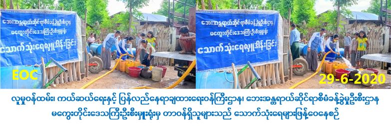 လူမှုဝန်ထမ်း၊ ကယ်ဆယ်ရေးနှင့် ပြန်လည်နေရာချထားရေးဝန်ကြီးဌာန၊ ဘေးအန္တရာယ် ဆိုင်ရာစီမံခန့်ခွဲမှုဦးစီးဌာန၊ မကွေးတိုင်းဒေသကြီးဦးစီးမှူးရုံးမှ တာဝန်ရှိသူများသည် (၂၉-၆-၂၀၂၀) ရက်နေ့၊ (၁၁:၀၀) နာရီအချိန်တွင် သောက်သုံးရေခက်ခဲသော မကွေးမြို့နယ်၊ ကြာကန်ကျေးရွာအုပ်စု၊ ကြာကန်ကျေးရွာ (မြောက်ပိုင်း၊ကွက်သစ်ပိုင်း)၊ ဦးဝင်းကြည် (တဲတိုက်)နှင့် ဒေါ်အေး(တဲတိုက်)ရှိ အိမ်ခြေ (၁၀၉) လုံး၊အိမ်ထောင်စု(၁၁၆) စု၊ လူဦးရေ (၅၄၇) ဦးတို့အတွက် သောက်သုံးရေဂါလံ (၆၀၀၀) အား သွားရောက်ဖြန့်ဝေပေးခဲ့ကြောင်း သတင်းရရှိပါသည်။