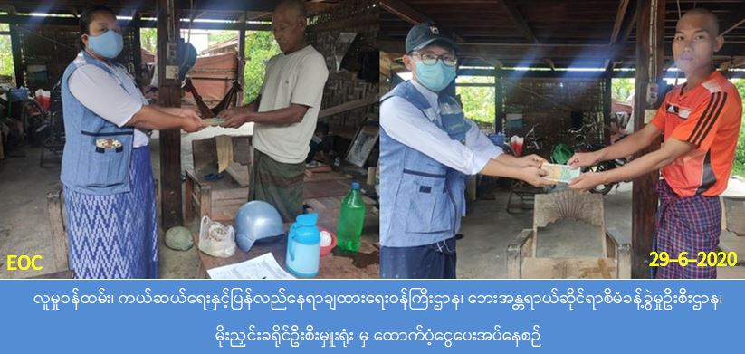 လူမှုဝန်ထမ်း၊ ကယ်ဆယ်ရေးနှင့်ပြန်လည်နေရာချထားရေးဝန်ကြီးဌာန၊ ဘေးအန္တရာယ်ဆိုင်ရာ စီမံခန့်ခွဲမှုဦးစီးဌာန၊ မိုးညှင်းခရိုင်ဦးစီးမှူးရုံးမှ တာဝန်ရှိသူများသည် (၂၄-၆-၂၀၂၀) ရက်နေ့ (၁၆:၃၀) အချိန်ခန့်၌ မိုးညှင်းမြို့နယ် တောင်အင်းကျေးရွာတွင် မိုးရွာသွန်း၍ မိုးကြိုးထိမှန်မှု ကြောင့် ဒဏ်ရာရရှိသူ (၂) ဦးအတွက် (၁) ဦးလျှင် ထောက်ပံ့ငွေ (၅၀,၀၀၀/-) ကျပ်နှုန်းဖြင့် စုစုပေါင်းထောက်ပံ့ငွေ (၁၀၀,၀၀၀/-) ကျပ်အား (၂၉-၆-၂၀၂၀) ရက်နေ့ (၁၅:၃၀) နာရီအချိန် တွင် ဘေးသင့်ပြည်သူများထံသို့ ထောက်ပံ့ပေးအပ်ခဲ့ပါကြောင်း သတင်းရရှိပါသည်။