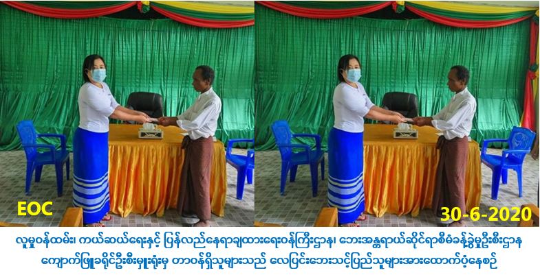 လူမှုဝန်ထမ်း၊ ကယ်ဆယ်ရေးနှင့် ပြန်လည်နေရာချထားရေးဝန်ကြီးဌာန၊ ဘေးအန္တရာယ် ဆိုင်ရာစီမံခန့်ခွဲမှုဦးစီးဌာန၊ ကျောက်ဖြူခရိုင်ဦးစီးမှူးရုံးမှ တာဝန်ရှိသူများသည် (၁၇-၆-၂၀၂၀) ရက်နေ့တွင် ကျောက်ဖြူမြို့နယ်၊ ငစိမ့်ပြင်ကျေးရွာအုပ်စု၊ လိပ်ပြင်ဒွိန်ကျေးရွာ၌ မိုးသည်းထန်စွာရွာသွန်းပြီး လေပြင်းတိုက်ခတ်မှုကြောင့် သွပ်မိုးထရံကာနေအိမ်(၁)လုံးနှင့် ဓနိမိုးထရံကာနေအိမ်(၅)လုံး စုစုပေါင်း တစ်စိတ်တစ်ပိုင်းပျက်စီးနေအိမ်(၆)လုံးအတွက် အိမ်ဆောက်ပစ္စည်းဖိုးထောက်ပံ့ငွေ (၁၂၀,၀၀ဝိ/-) ကျပ်နှင့် အိမ်ထောင်စု(၆)စုမှ လူဦးရေ (၂၄)ဦးအတွက် ဆန်ရိက္ခာ(၇)ရက်စာဖိုးထောက်ပံ့ငွေ (၅၀,၄၀ဝိ/-) ကျပ်၊ စုစုပေါင်း ထောက်ပံ့ငွေ (၁၇၀,၄၀ဝိ/) ကျပ်အား လိပ်ပြင်ဒွိန်ကျေးရွာအုပ်ချုပ်ရေးမှူးထံသို့ (၃၀-၆-၂၀၂၀) ရက်နေ့၊ (၁၁:၄၅)နာရီအချိန်တွင် လွှဲပြောင်းထောက်ပံ့ခဲ့ကြောင်း သတင်းရရှိပါသည်။