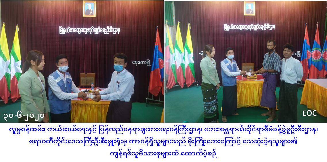 လူမှုဝန်ထမ်း၊ ကယ်ဆယ်ရေးနှင့် ပြန်လည်နေရာချထားရေးဝန်ကြီးဌာန၊ ဘေးအန္တရာယ်ဆိုင်ရာစီမံခန့်ခွဲမှုဦးစီးဌာန၊ ဧရာဝတီတိုင်းဒေသကြီးဦးစီးမှူးရုံးမှ တာ၀န်ရှိသူများသည် ပုသိမ်ခရိုင်၊ ငပုတောမြို့နယ်၊ အုပ်ရှစ်ကွင်းကျေးရွာအုပ်စု၊ အုပ်ရှစ်ကွင်းကျေးနှင့် ဘီးလူးကုန်းကျေးရွာတို့၌ (၂၆-၆-၂၀၂၀) ရက်နေ့တွင် ဖြစ်ပွားခဲ့သော မိုးကြိုးဘေးကြောင့် သေဆုံးခဲ့သူ (၂)ဦးအတွက် (၁)ဦးလျှင် ထောက်ပံ့ငွေ (၃၀၀၀၀ဝိ/-)နှုန်းဖြင့် (၂)ဦးအတွက် (၆၀၀၀၀ဝိ/-) တိတိအား (၃၀-၆-၂၀၂၀) ရက်နေ့၊ (၁၀:၀၀) နာရီအချိန်တွင် ငပုတောမြို့နယ် အထွေထွေအုပ်ချုပ်ရေးဦးစီးဌာနမှ တာဝန်ရှိသူများနှင့်အတူ ဘေးသင့်ပြည်သူများ၏ ကျန်ရစ်သူမိသားစုဝင်များထံ လက်ဝယ်အရောက် ထောက်ပံ့ပေးအပ်ခဲ့ကြောင်း သတင်းရရှိပါသည်။