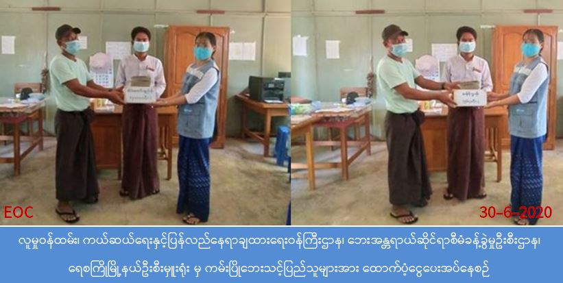 လူမှုဝန်ထမ်း၊ ကယ်ဆယ်ရေးနှင့်ပြန်လည်နေရာချထားရေးဝန်ကြီးဌာန၊ ဘေးအန္တရာယ်ဆိုင်ရာ စီမံခန့်ခွဲမှုဦးစီးဌာန၊ ရေစကြိုမြို့နယ်ဦးစီးမှူးရုံးမှ တာဝန်ရှိသူများသည် (၂၉-၆-၂၀၂၀) ရက်နေ့၊ (၁၄:၀၀) နာရီအချိန်၌ ရေစကြိုမြို့နယ်၊ ကွေ့ထောင့်ကျေးရွာအုပ်စု၊ ကွေ့ထောင့်ကျေးရွာနှင့် အောင်ပန်းချောင်းကျေးရွာအုပ်စု၊ အောင်ပန်းချောင်းကျေးရွာတို့တွင် ဧရာဝတီမြစ်ရေနှင့် ချင်း တွင်းမြစ်ရေတိုက်စား ကမ်းပါးပြိုကျမှုကြောင့် ကြိုတင်ဖျက်သိမ်းပြောင်းရွှေ့ လူနေအိမ် (၇) လုံး၊ အိမ်ထောင်စု (၈) စု၊ လူဦးရေ (၂၇) ဦးတို့အတွက် အိမ်ဆောက်ပစ္စည်းဖိုးထောက်ပံ့ငွေ (၇၀၀,၀၀၀/-)ကျပ်၊ ဆန်ရိက္ခာဖိုးထောက်ပံ့ငွေ (၅၆,၇၀၀/-) ကျပ်၊ စုစုပေါင်းထောက်ပံ့ငွေ (၇၅၆,၇၀ဝ/-) ကျပ်အား (၃၀-၆-၂၀၂၀) ရက်နေ့၊ (၁၄:၀၀) နာရီအချိန်တွင် ရေစကြိုမြို့နယ် အထွေထွေအုပ်ချုပ်ရေးရုံး၌ မြို့နယ်အထွေထွေအုပ်ချုပ်ရေးရုံးမှ တာဝန်ရှိသူနှင့်အတူ ကျေးရွာ အုပ်ချုပ်ရေးမှူးလက်ဝယ်အရောက် ထောက်ပံ့ပေးအပ်ခဲ့ပါကြောင်း သတင်းရရှိပါသည်။