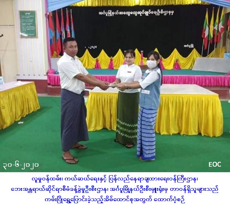 လူမှုဝန်ထမ်း၊ ကယ်ဆယ်ရေးနှင့် ပြန်လည်နေရာချထားရေးဝန်ကြီးဌာန၊ ဘေးအန္တရာယ်ဆိုင်ရာစီမံခန့်ခွဲမှုဦးစီးဌာန၊ အင်္ဂပူမြို့နယ်ဦးစီးမှူးရုံးမှ တာ၀န်ရှိသူများသည် အင်္ဂပူ မြို့နယ်၊ ကံဘက်ကျေးရွာအုပ်စု၊ သာယာကုန်းကျေးရွာ၌ (၂၇-၆-၂၀၂၀) ရက်နေ့တွင် ကမ်းပြိုရွှေ့ပြောင်းခဲ့သည့်အိမ်ခြေ(၁)လုံး၊ ၄င်းအိမ်ထောင်စု(၁)စုရှိ လူဦးရေ(၂)ဦးတို့အတွက် အိမ်ဆောက်ပစ္စည်းဖိုး(၁၀၀၀၀၀)ကျပ်၊ ဆန်ရိက္ခာဖိုး(၄၂၀၀)ကျပ် စုစုပေါင်းထောက်ပံ့ရန်ပုံငွေ (၁၀၄၂၀၀)ကျပ်ကို (၃၀-၆-၂၀၂၀) ရက်နေ့၊ (၁၄:၀၀) နာရီအချိန်တွင်အင်္ဂပူမြို့နယ်အထွေထွေအုပ်ချုပ်ရေးဦးစီးဌာနမှ တာ၀န်ရှိသူများနှင့်အတူ ဘေးသင့်ပြည်သူလက်ဝယ်အရောက် ထောက်ပံ့ပေးအပ်ခဲ့ကြောင်း သတင်းရရှိပါသည်။
