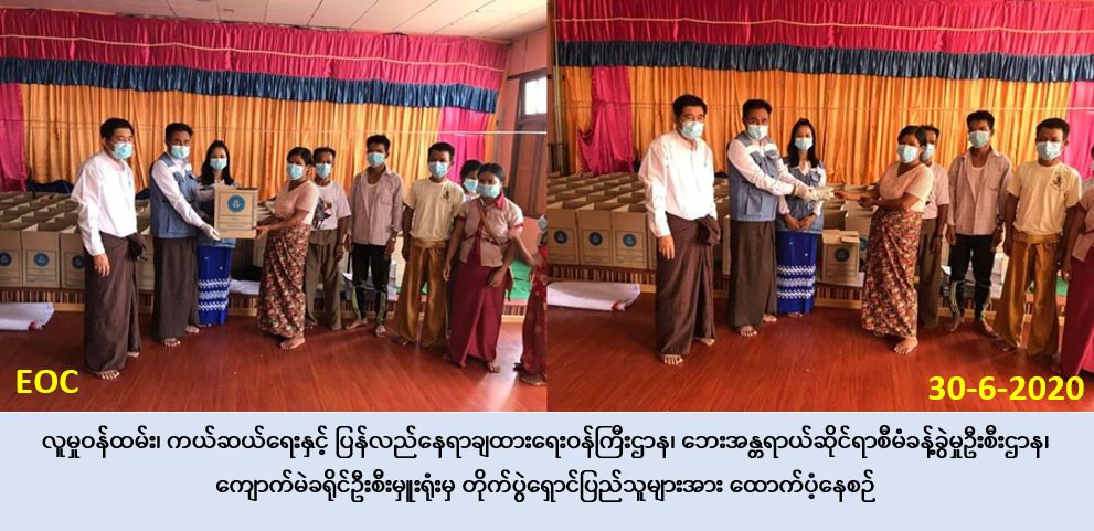လူမှုဝန်ထမ်း၊ ကယ်ဆယ်ရေးနှင့် ပြန်လည်နေရာချထားရေး၀န်ကြီးဌာန၊ ဘေးအန္တရာယ်ဆိုင်ရာ စီမံခန့်ခွဲမှုဦးစီးဌာန၊ ကျောက်မဲခရိုင်ဦးစီးမှူးရုံးမှ တာဝန်ရှိသူများသည် (၂၉-၆-၂၀၂၀)ရက်နေ့၌ ကျောက်မဲမြို့နယ်၊ ဟဲကွီကျေးရွာအုပ်စု၊ ပန်ကျင်ကျေးရွာတို့မှ ပြည်သူများသည် နောင်ပိန် ဓမ္မာရုံသို့ တိမ်းရှောင်ရောက်ရှိလာသည့် တိုက်ပွဲရှောင် အိမ်ထောင်စု(၉၅)စုအတွက် ကယ်ဆယ် ရေးပစ္စည်း (၁၀) မျိုးပါ (၉၅)ပုံး၊ထောက်ပံ့ငွေ(၁၁၈၈၄၅ဝိ/-)ကျပ်၊ လူဦးရေ(၄၂၅) ဦးအတွက် ဆန်ရိက္ခာဖိုးငွေ(၈၉၂၅၀ဝိ/-) ကျပ်အား (၃၀-၆-၂၀၂၀) ရက်နေ့၊ (၁၃:၀၀) နာရီအချိန်၊ နောင်ပိန် ဓမ္မာရုံတွင် ပြည်သူများလက်၀ယ်အရောက် ထောက်ပံ့ပေးအပ်ခဲ့ကြောင်း သတင်းရရှိပါသည်။ ++Zawgyi Version++