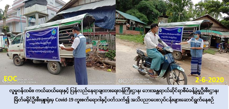 လူမှုဝန်ထမ်း၊ ကယ်ဆယ်ရေးနှင့် ပြန်လည်နေရာချထားရေး၀န်ကြီးဌာန၊ ဘေးအန္တရာယ်ဆိုင်ရာ စီမံခန့်ခွဲမှုဦးစီးဌာန၊ မြိတ်ခရိုင်ဦးစီးမှူးရုံးမှ တာဝန်ရှိသူများသည် (၂ – ၇ – ၂၀၂၀)ရက်နေ့၊ နံနက်(၁၀ : ၀၀)နာရီအချိန်တွင် ဂဝေသီအခမဲ့စာသင်ဝိုင်းပရဟိတအဖွဲ့တို့နှင့် ပူးပေါင်း၍ ငေပုလဲရပ်ကွက်၊ ရှမ်းချောင်းရပ်ကွက်၊ ရွာသစ်ရပ်ကွက်တို့တွင် COVID – 19 အသက်ရှူလမ်း ကြောင်းဆိုင်ရာ ရောဂါနဲ့ပတ်သက်၍ အများပြည်သူသိရှိလိုက်နာနိုင်ရန် ကျန်းမာရေးနှင့်အား ကစားဝန်ကြီးဌာနမှ ထုတ်ပြန်ထားသော အသိပေးကြေငြာချက်များနှင့် မိုးကြိုးဘေး၊ ရေဘေး ၊မြေပြိုဘေးနှင့်စပ်လျဥ်း၍ ဌာနမှထုတ်ပြန်ထားသည့် လက်ကမ်းစာစောင်ပါအချက်အလက်များ၊ သဘာဝဘေးအသိပညာပေးခြင်းများအား ဆောင်ရွက်ခဲ့ကြောင်း သတင်းရရှိပါသည်။