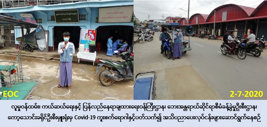 လူမှုဝန်ထမ်း၊ ကယ်ဆယ်ရေးနှင့် ပြန်လည်နေရာချထားရေး၀န်ကြီးဌာန၊ ဘေးအန္တရာယ်ဆိုင်ရာ စီမံခန့်ခွဲမှုဦးစီးဌာန၊ ကော့သောင်းခရိုင်ဦးစီးမှူးရုံးမှ တာဝန်ရှိသူများသည် (၂-၇-၂၀၂၀ရက်နေ့ တွင် ကော့သောင်းခရိုင်၊ ကော့သောင်းမြို့၊ ရွှေဇင်ယော်ရပ်ကွက်အတွင်းရှိ ပြည်သူများအား မိုး ရာသီကာလအတွင်းဖြစ်ပေါ်နိုင်သော သဘာဝဘေးအန္တရာယ်များနှင့်ပက်သက်၍ ဆောင်ရန်/ ရှောင်ရန်များ၊ covid-19 ရောဂါနှင့်ပက်သက်၍ အသိပညာပေးခြင်း၊ လော်စပီကာ၊ Hand Speakerဖြင့် လိုက်လံဆော်သြခြင်းများ ဆောင်ရွက်ခဲ့ကြောင်း သတင်းရရှိပါသည်။