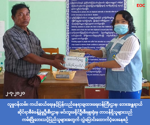 လူမှုဝန်ထမ်း၊ ကယ်ဆယ်ရေးနှင့် ပြန်လည်နေရာချထားရေးဝန်ကြီးဌာန၊ ဘေးအန္တရာယ်ဆိုင်ရာ စီမံခန့်ခွဲမှု ဦးစီးဌာန၊ မင်းဘူးခရိုင်ဦးစီးမှူးရုံးမှ တာဝန်ရှိသူများသည် မင်းဘူး (စကု)မြို့နယ်၊ နိဗ္ဗာန်ကျွန်းကျေးရွာ အုပ်စု၊ နိဗ္ဗာန်ကျွန်းကျေးရွာတွင် (၁-၇-၂၀၂၀) ရက်နေ့၌ ဖြစ်ပွားခဲ့သော ဧရာဝတီမြစ်ရေတိုက်စား၍ ကမ်းပါးပြိုကျမှုကြောင့် ကမ်းပြိုဘေးသင့်အိမ်ခြေ (၁၅) လုံး၊ အိမ်ထောင်စု (၁၅) စုတို့အတွက် အိမ်ဆောက်ပစ္စည်းဖိုး(၁,၅၀၀,၀၀၀)ကျပ်၊ လူဦးရေ(၆၅)ဦးအတွက် ဆန်ရိက္ခါ(၇)ရက်စာ (၁၃၆,၅၀၀) ကျပ်၊ စုစုပေါင်းထောက်ပံ့ငွေ (၁,၆၃၆,၅၀၀) ကျပ်တို့ကို (၂-၇-၂၀၂၀)ရက်နေ့၊ (၁၅:၀၀)အချိန်တွင် ကျေးရွာ အုပ်ချုပ်ရေးမှူးထံသို့ လွှဲပြောင်းထောက်ပံ့ပေးအပ်ခဲ့ကြောင်း သိရှိရပါသည်။