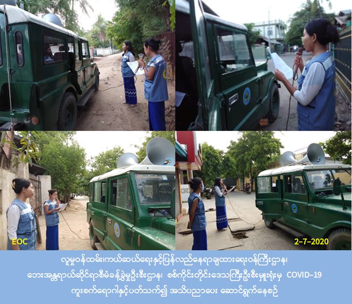 လူမှုဝန်ထမ်း၊ ကယ်ဆယ်ရေးနှင့် ပြန်လည်နေရာချထားရေးဝန်ကြီးဌာန၊ ဘေးအန္တရာယ်ဆိုင်ရာစီမံခန့်ခွဲမှုဦးစီးဌာန၊ စစ်ကိုင်းတိုင်းဒေသကြီးဦးစီးမှူးရုံးမှ တာဝန်ရှိသူများသည် (၂-၇-၂၀၂၀) ရက်နေ့တွင် စစ်ကိုင်းတိုင်းဒေသကြီး၊ မုံရွာမြို့နယ်၊ မြဝတီရပ်ကွက်၊ ရှောက်ခါးရပ်ကွက်၊ ရှောက်ခါး(တိုးချဲ့)ရပ်ကွက်များတွင် Covid-19 ရောဂါကူးစက်ပျံ့နှံမှုများမဖြစ်ပွားစေနိုင်ရန်အတွက် အများပြည်သူများ အလွယ်တကူသိရှိ လိုက်နာဆောင်ရွက်ရန်များကို အသိပေးဆောင်ရွက်ခြင်းလုပ်ငန်းများကို ဆောင်ရွက်ခဲ့ပါကြောင်း သတင်းရရှိပါသည်။