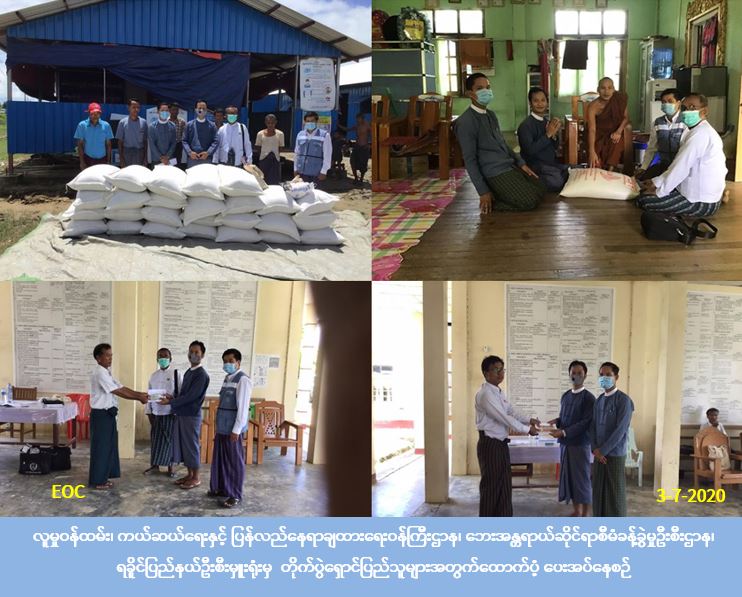 လူမှုဝန်ထမ်း၊ ကယ်ဆယ်ရေးနှင့် ပြည်လည်နေရာချထားရေးဝန်ကြီးဌာန၊ ဘေးအန္တရာယ်ဆိုင်ရာစီမံခန့်ခွဲမှုဦးစီးဌာန၊ ရခိုင်ပြည်နယ်ဦးစီးမှူးရုံးမှတာဝန်ရှိသူများသည် (၃-၇-၂၀၂၀) ရက်နေ့တွင် ပုဏ္ဏားကျွန်းမြို့နယ်၊ အောင်မင်္ဂလာဘုန်းတော်ကြီးကျောင်း၌ အိမ်ထောင်စု(၁)စု လူဦးရေ(၅)ဦး၊ ဓမ္မမဏ္ဍိုင်ဘုန်းတော်ကြီး၌ အိမ်ထောင်စု (၉) စု၊ လူဦးရေ (၅၇) ဦး၊ စက်မှုဇုန်မြေနေရာစခန်း၌ အိမ်ထောင်စု(၅၁)စု၊ လူဦးရေ(၁၇၉)ဦး ထပ်တိုးရောက်ရှိလာသည့် တိုက်ပွဲရှောင်ပြည်သူများ အတွက် ဆန်ရိက္ခါ (၂) ပတ်စာအတွက် (၃၅) အိတ် (၃) ပြည် (၄) ဗူးအားလည်းကောင်း အောင်ဖြူပြင်ကျေရွာဘုန်းတော်ကြီးကျောင်း၌ အိမ်ထောင်စု(၄၆)စု၊ လူဦးရေ(၂၃၅)ဦး၊ သရက်ချိုကျေးရွာဘုန်းတော်ကြီးကျောင်း၌ အိမ်ထောင်စု(၆၄)စု၊ လူဦးရေ(၃၄၆)ဦး၊ ပန်းနီလာကျေးရွာဘုန်းတော်ကြီးကျောင်း၌ အိမ်ထောင်စု(၂၇)စု၊ လူဦးရေ(၁၂၀)ဦး၊ ယိုးငူကျေးရွာဘုန်းတော်ကြီး၌ အိမ်ထောင်စု(၇၆)၊ လူဦးရေ(၃၇၃)ဦး၊ မှိုဟင်းတောကျေးရွာဘုန်းတော်ကြီးကျောင်း၌ အိမ်ထောင်စု(၁၆)စု၊ လူဦးရေ(၇၀)ဦး၊ သင်ပုန်းတန်း ကျေးရွာဘုန်းတော်ကြီးကျောင်း၌ အိမ်ထောင်စု(၆၈)စု၊ လူဦးရေ(၂၂၅)ဦး၊ အလယ်ချောင်းကျေးရွာဘုန်းတော်ကြီးကျောင်း၌ အိမ်ထောင်စု(၅၀)စု၊ လူဦးရေ(၁၉၀)ဦး၊ မကျည်းချောင်းကျေးရွာဘုန်းတော်ကြီးကျောင်း၌ အိမ်ထောင်စု(၄)စု၊ လူဦးရေ(၁၃)ဦး၊ ကံပြင်ကျေးရွာဘုန်းတော်ကြီးကျောင်း၌ အိမ်ထောင်စု(၄၈)စု၊ လူဦးရေ(၂၃၇)ဦး ထပ်မံရောက်ရှိလာသည့်တိုက်ပွဲရှောင်ပြည်သူ (၁,၈၀၉) ဦးအတွက် ဆန်ရိက္ခာ(၂)
